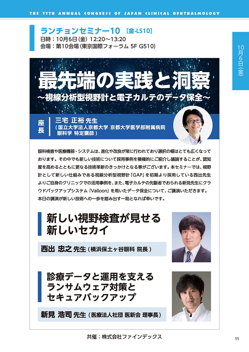 ランチョンセミナー10 最先端の実践と洞察~視線分析型視野計と電子カルテのデータ保全~ 2023年10月6日(金) 12:20 - 13:20 第10会場 | 東京国際フォーラム 5F G510 共催:株式会社ファインデックス |