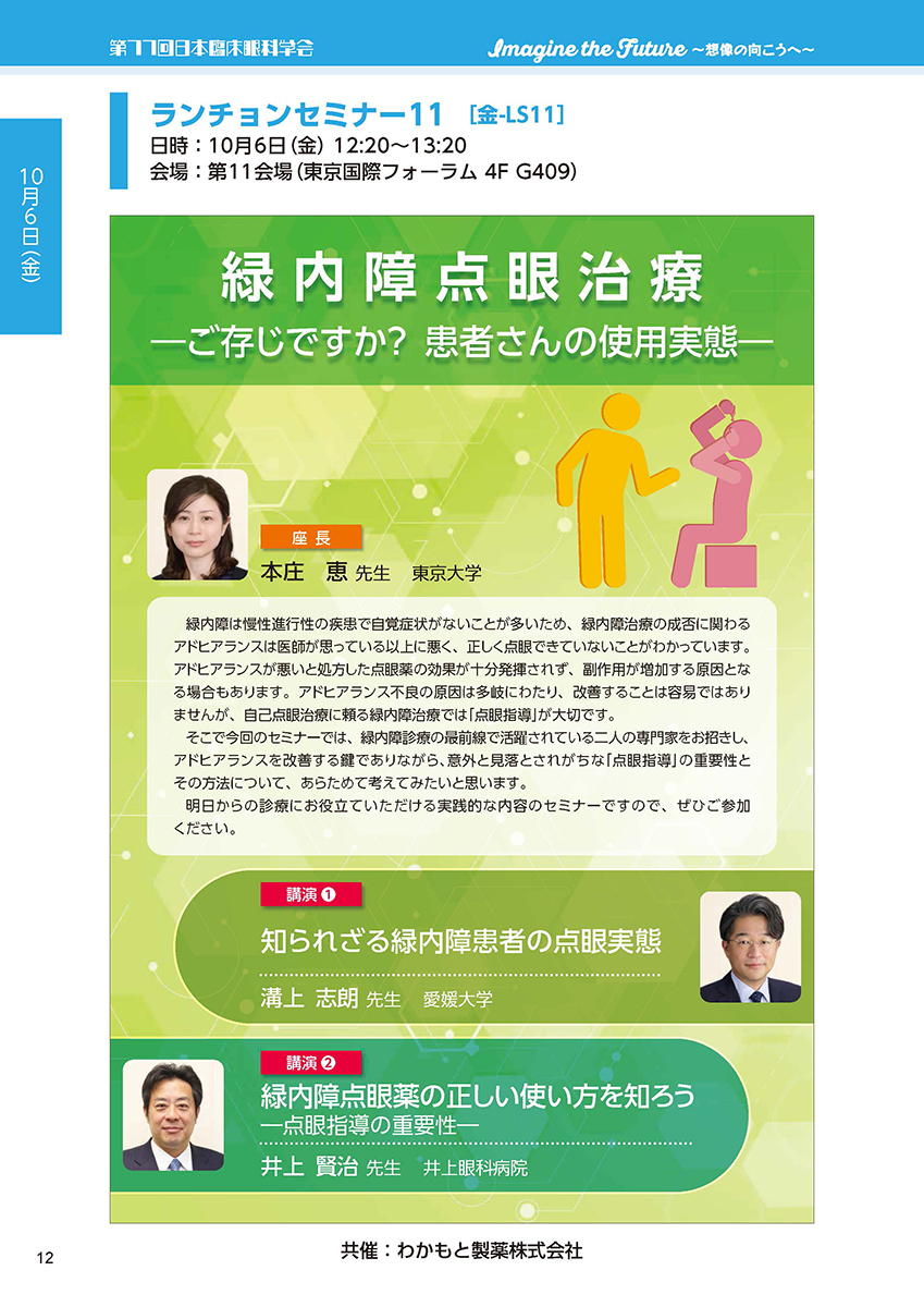 ランチョンセミナー11 緑内障点眼治療 -ご存じですか? 患者さんの使用実態- 2023年10月6日(金) 12:20 - 13:20 第11会場 | 東京国際フォーラム 4F G409 共催:わかもと製薬株式会社 |