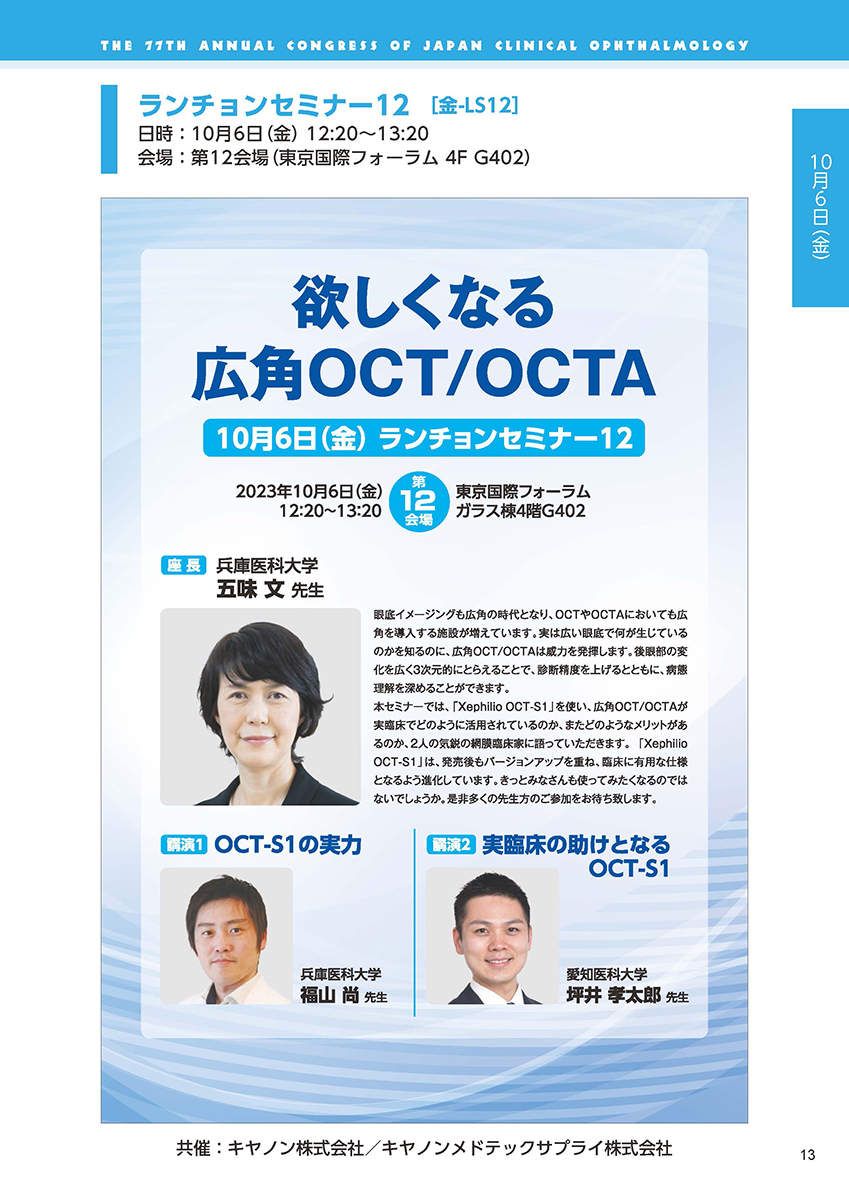 ランチョンセミナー12 欲しくなる広角OCT/OCTA 2023年10月6日(金) 12:20 - 13:20 第12会場 | 東京国際フォーラム 4F G402 共催:キヤノン株式会社/キヤノンメドテックサプライ株式会社 |