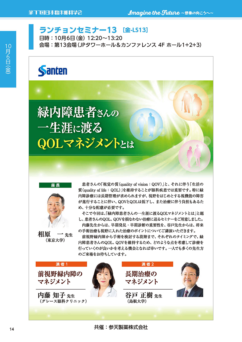 ランチョンセミナー13 緑内障患者さんの一生涯に渡るQOLマネジメントとは 2023年10月6日(金) 12:20 - 13:20 第13会場 | JPタワーホール&カンファレンス 4F ホール1+2+3 共催:参天製薬株式会社 |