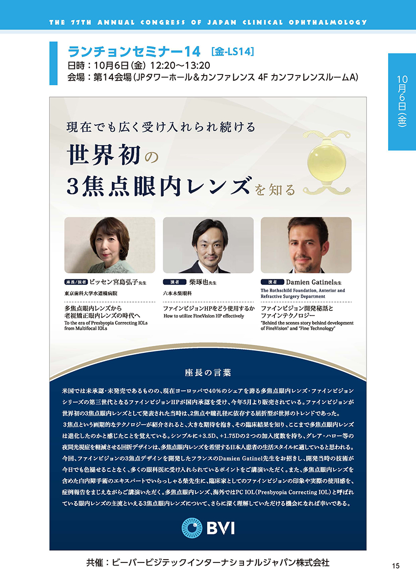 ランチョンセミナー14 現在でも広く受け入れられ続ける 世界初の3焦点眼内レンズを知る 2023年10月6日(金) 12:20 - 13:20 第14会場 | JPタワーホール&カンファレンス 4F カンファレンスルームA 共催:ビーバービジテックインターナショナルジャパン株式会社 |