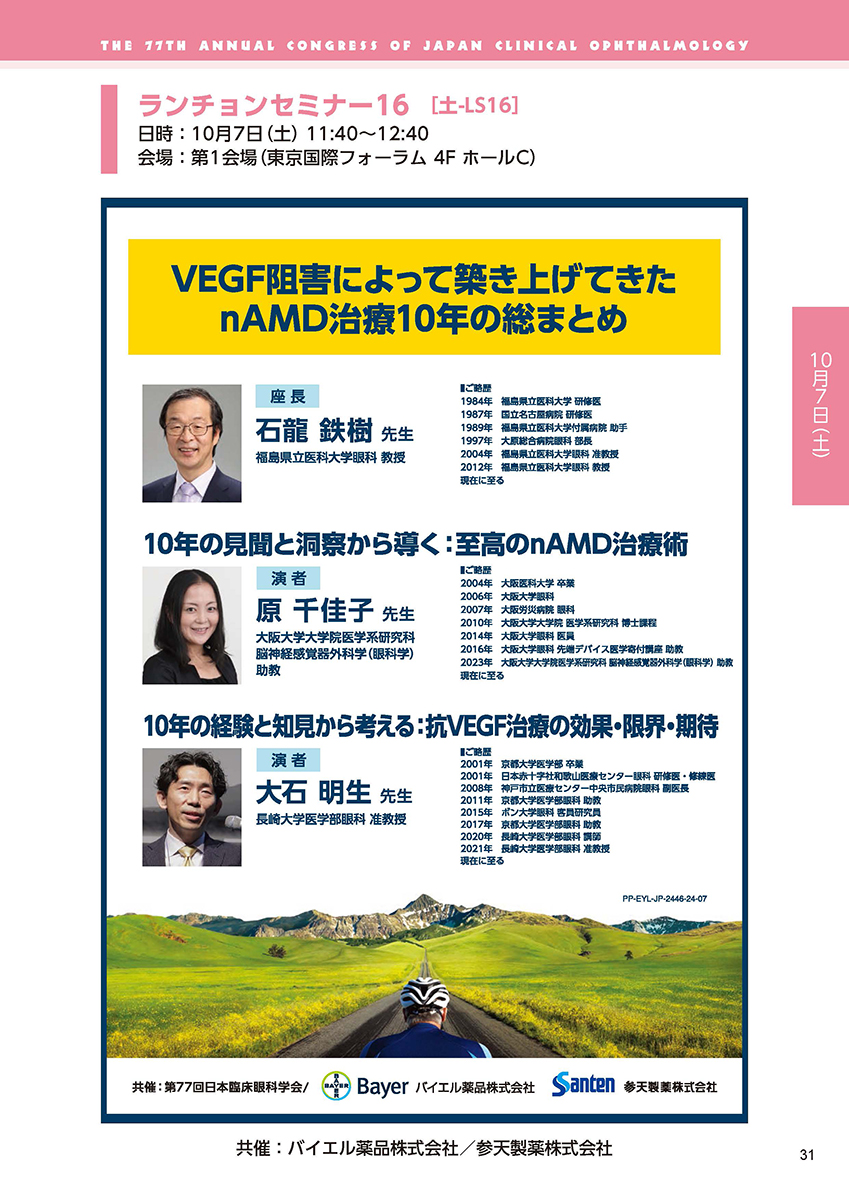 ランチョンセミナー16 VEGF阻害によって築き上げてきたnAMD治療10年の総まとめ 2023年10月7日(土) 11:40 - 12:40 第1会場 | 東京国際フォーラム 4F ホールC 共催:バイエル薬品株式会社/参天製薬株式会社 |