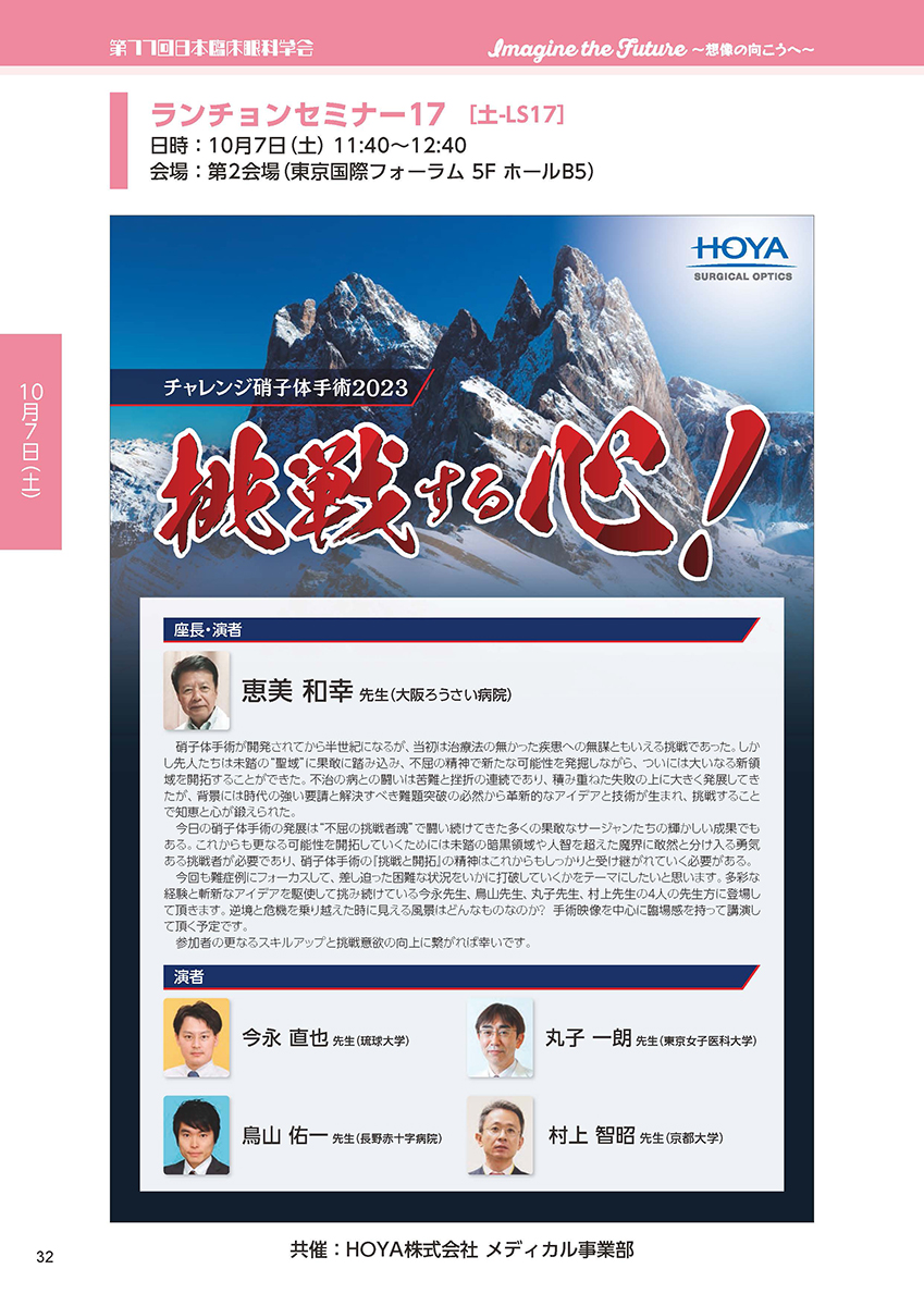 ランチョンセミナー17 チャレンジ硝子体手術2023~挑戦する心!~ 2023年10月7日(土) 11:40 - 12:40 第2会場 | 東京国際フォーラム 5F ホールB5 共催:HOYA株式会社 メディカル事業部 |