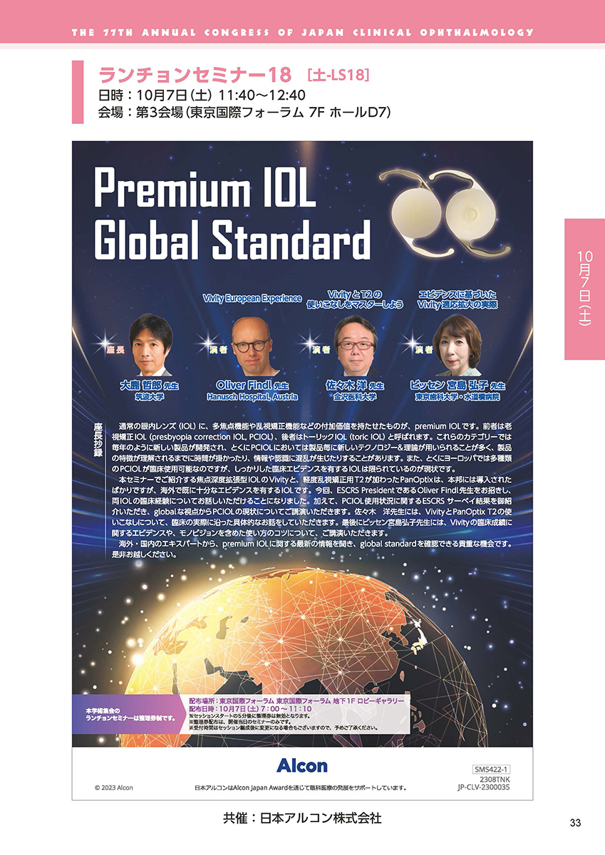 ランチョンセミナー18 Premium IOL Global Standard 2023年10月7日(土) 11:40 - 12:40 第3会場 | 東京国際フォーラム 7F ホールD7 共催:日本アルコン株式会社 |