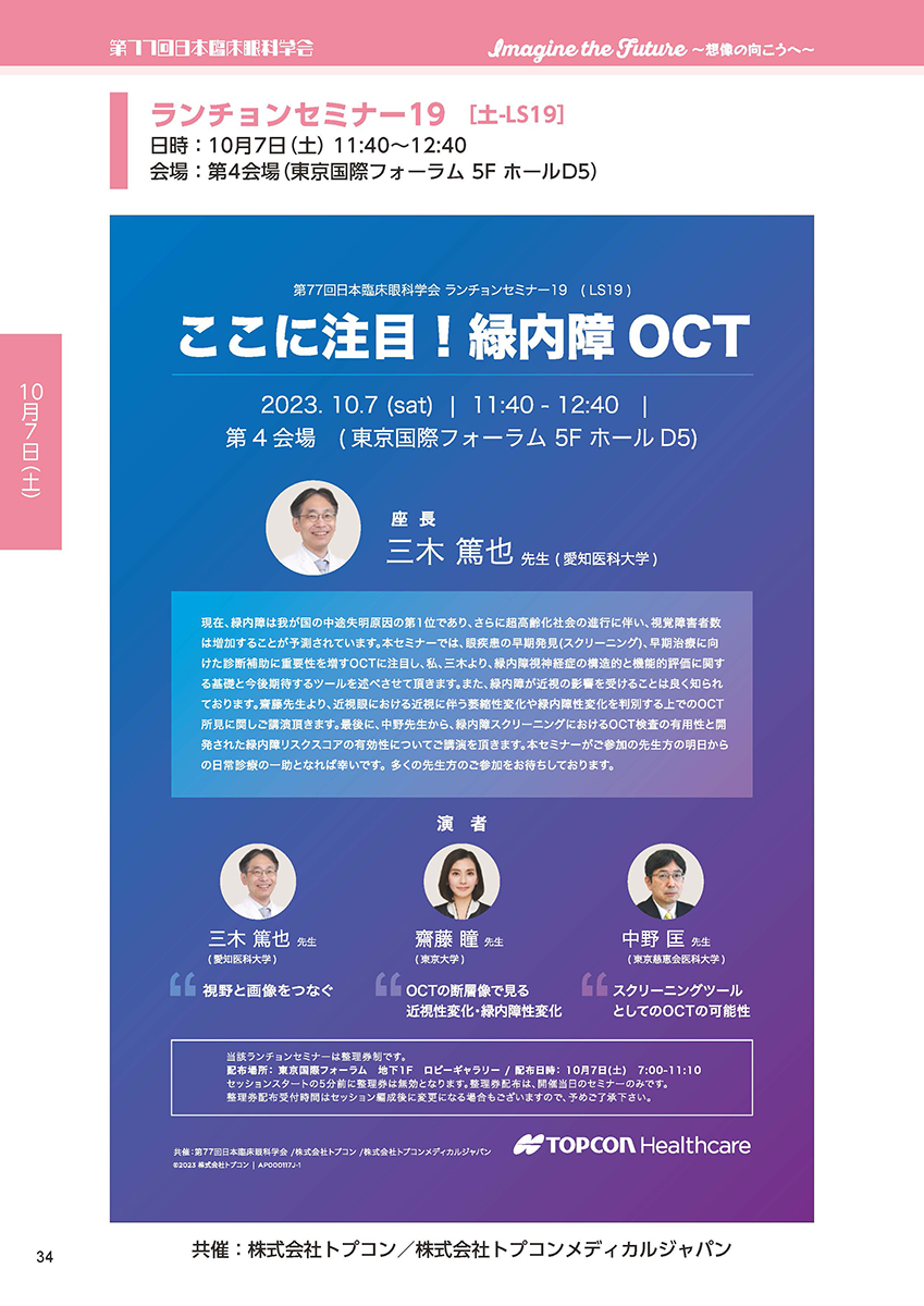 ランチョンセミナー19 ここに注目!緑内障OCT 2023年10月7日(土) 11:40 - 12:40 第4会場 | 東京国際フォーラム 5F ホールD5 共催:株式会社トプコン/株式会社トプコンメディカルジャパン |