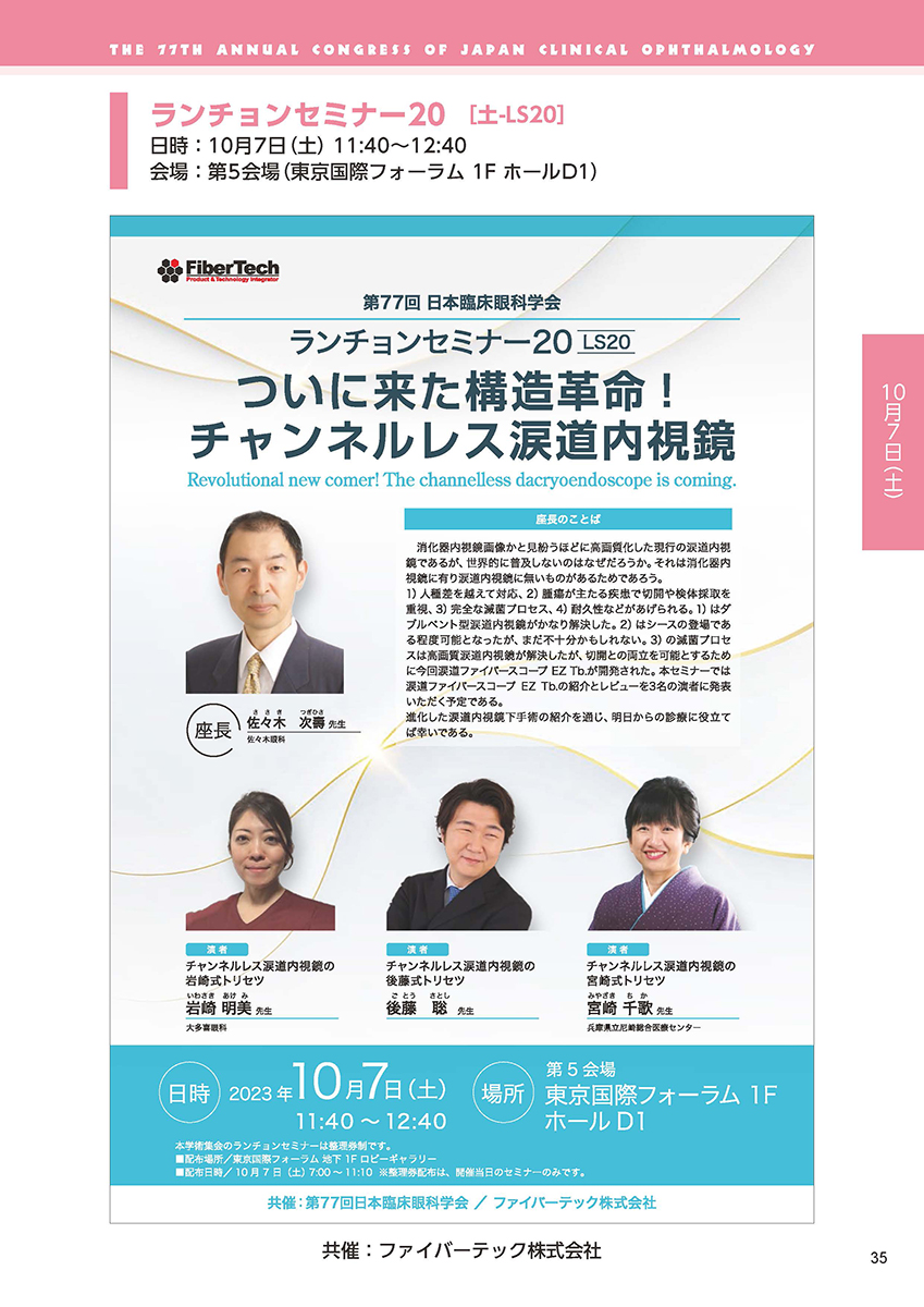 ランチョンセミナー20 ついに来た構造革命! チャンネルレス涙道内視鏡 2023年10月7日(土) 11:40 - 12:40 第5会場 | 東京国際フォーラム 1F ホールD1 共催:ファイバーテック株式会社 |