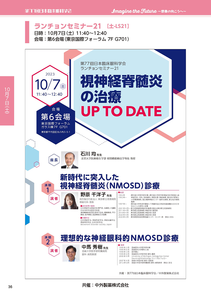 ランチョンセミナー21 視神経脊髄炎の治療UP TO DATE 2023年10月7日(土) 11:40 - 12:40 第6会場 | 東京国際フォーラム 7F G701 共催:中外製薬株式会社 |