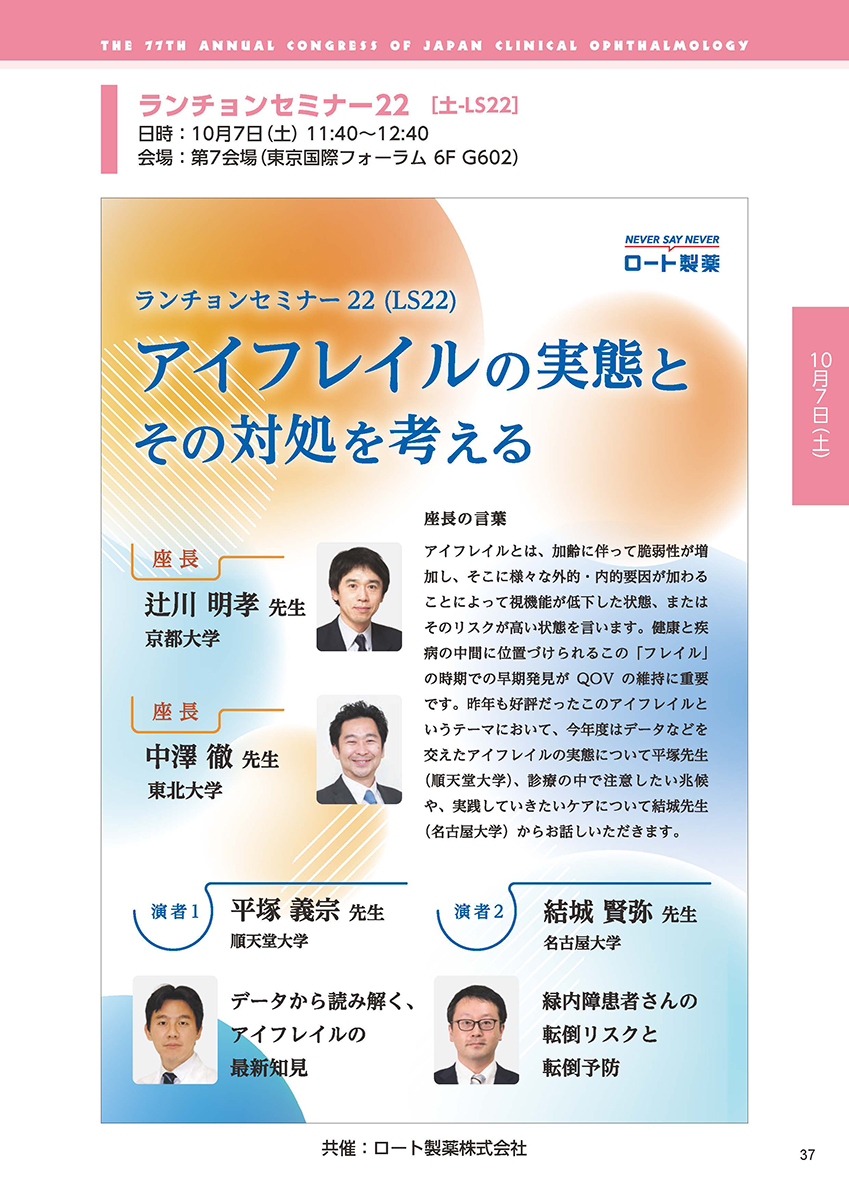 ランチョンセミナー22 アイフレイルの実態とその対処を考える 2023年10月7日(土) 11:40 - 12:40 第7会場 | 東京国際フォーラム 6F G602 共催:ロート製薬株式会社 |