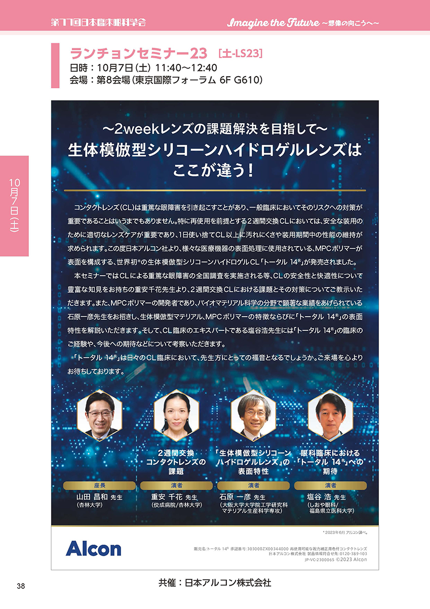 ランチョンセミナー23 ~2weekレンズの課題解決を目指して~生体模倣型シリコーンハイドロゲルレンズはここが違う! 2023年10月7日(土) 11:40 - 12:40 第8会場 | 東京国際フォーラム 6F G610 共催:日本アルコン株式会社 |