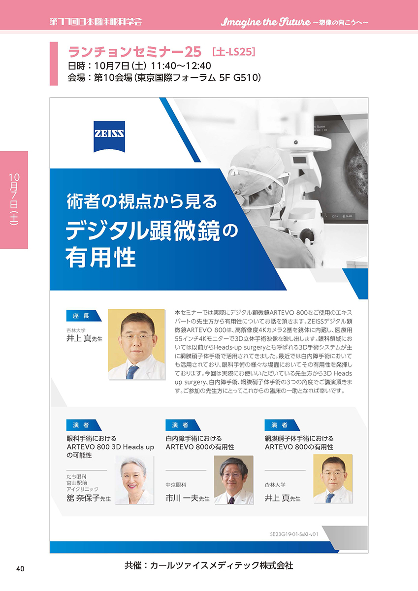 ランチョンセミナー25 術者の視点から見るデジタル顕微鏡の有用性 2023年10月7日(土) 11:40 - 12:40 第10会場 | 東京国際フォーラム 5F G510 共催:カールツァイスメディテック株式会社 |