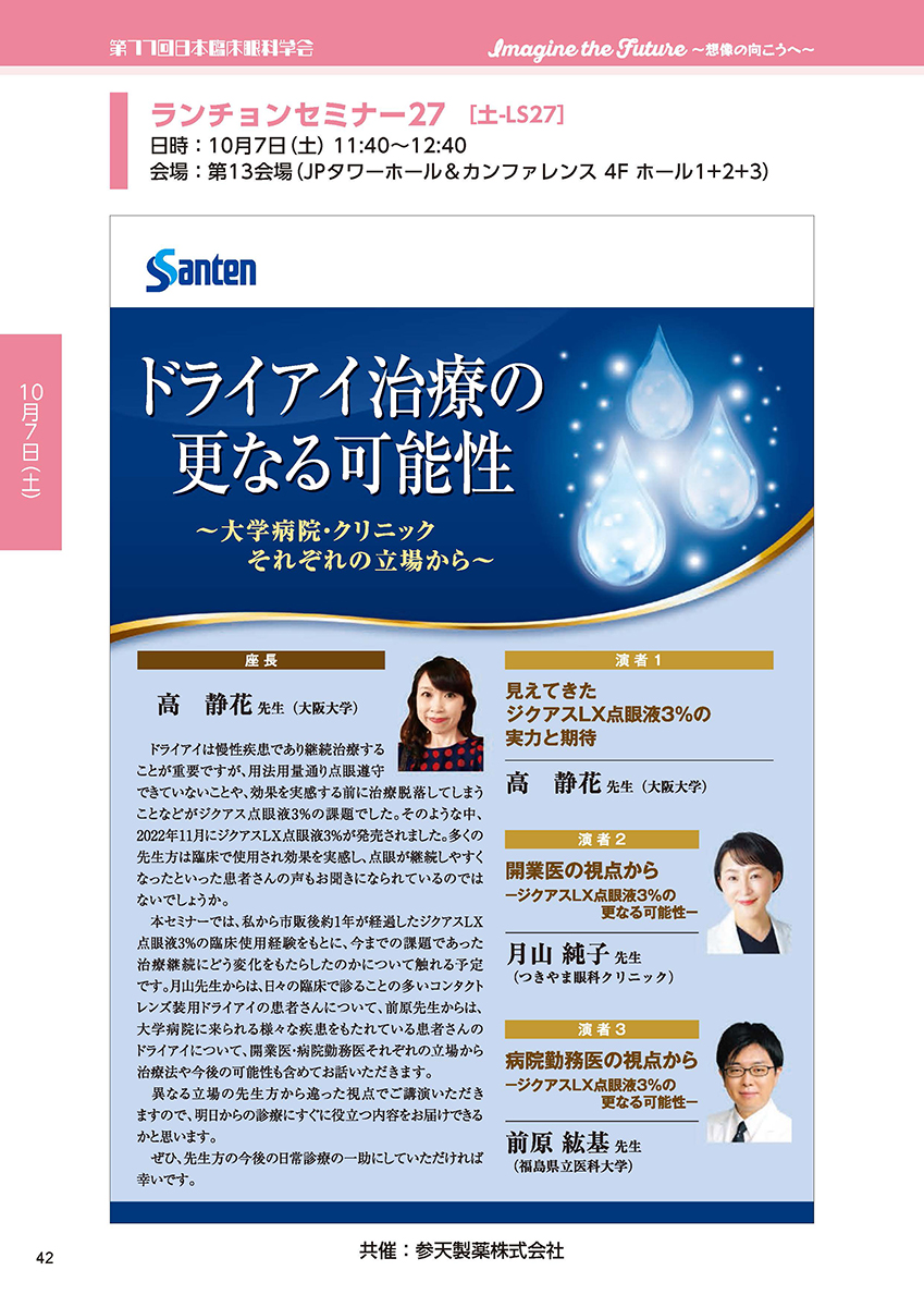 ランチョンセミナー27 ドライアイ治療の更なる可能性 ~大学病院・クリニックそれぞれの立場から~ 2023年10月7日(土) 11:40 - 12:40 第13会場 | JPタワーホール&カンファレンス 4F ホール1+2+3 共催:参天製薬株式会社 |