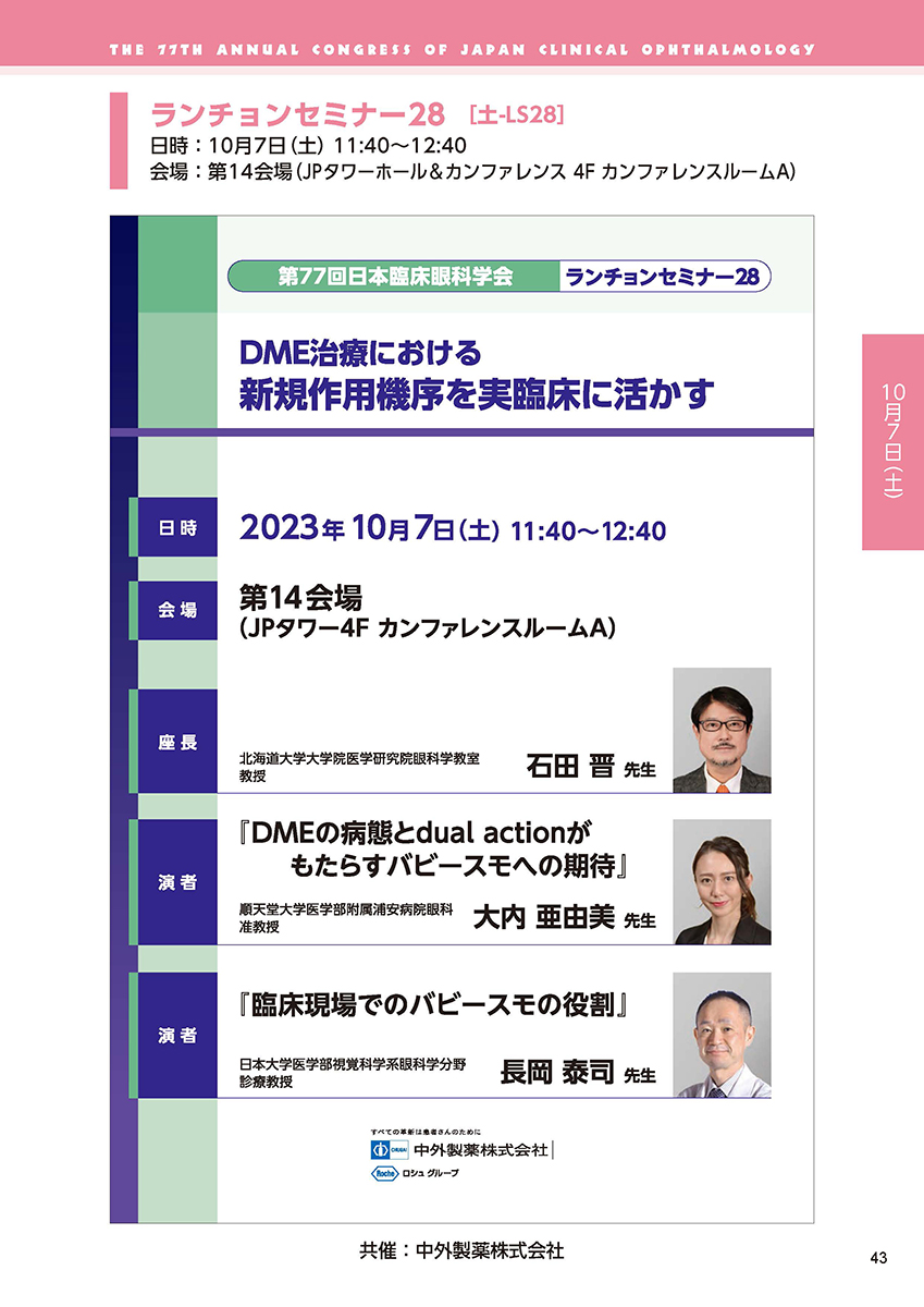 ランチョンセミナー28 DME治療における新規作用機序を実臨床に活かす 2023年10月7日(土) 11:40 - 12:40 第14会場 | JPタワーホール&カンファレンス 4F カンファレンスルームA 共催:中外製薬株式会社 |