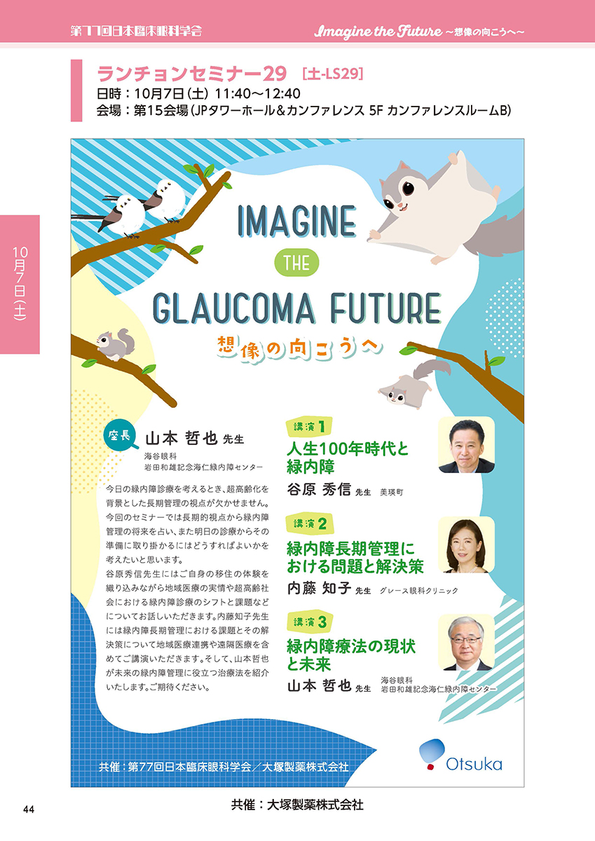 ランチョンセミナー29 IMAGINE THE GLAUCOMA FUTURE ~想像の向こうへ~ 2023年10月7日(土) 11:40 - 12:40 第15会場 | JPタワーホール&カンファレンス 5F カンファレンスルームB 共催:大塚製薬株式会社 |