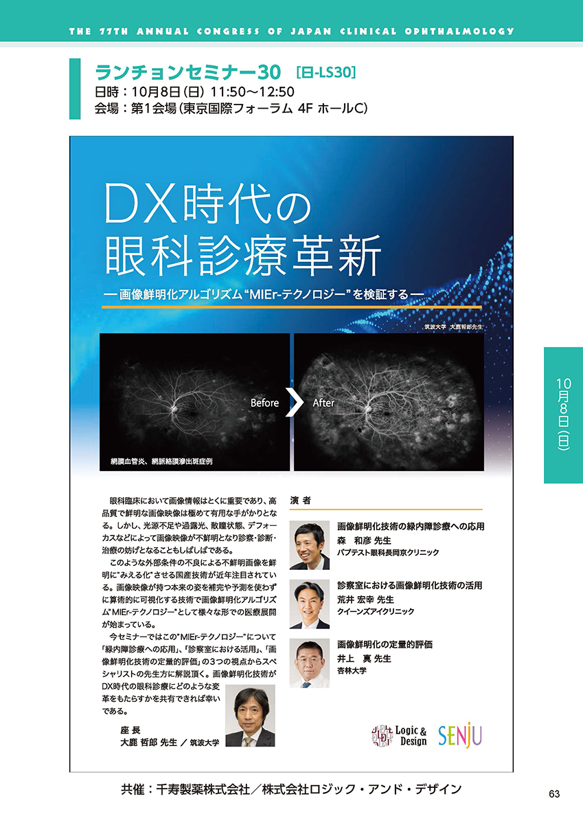 ランチョンセミナー30 DX時代の眼科診療革新 2023年10月8日(日) 11:50 - 12:50 第1会場 | 東京国際フォーラム 4F ホールC 共催:千寿製薬株式会社/株式会社ロジック・アンド・デザイン |