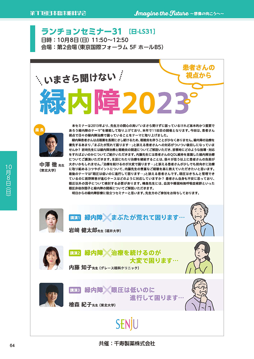 ランチョンセミナー31 いまさら聞けない緑内障2023 ~患者さんの視点から~ 2023年10月8日(日) 11:50 - 12:50 第2会場 | 東京国際フォーラム 5F ホールB5 共催:千寿製薬株式会社 |