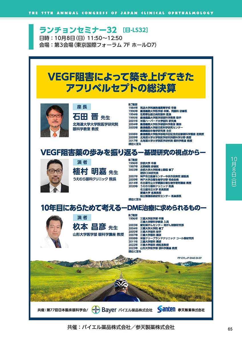 ランチョンセミナー32 VEGF阻害によって築き上げてきたアフリベルセプトの総決算 2023年10月8日(日) 11:50 - 12:50 第3会場 | 東京国際フォーラム 7F ホールD7 共催:バイエル薬品株式会社/参天製薬株式会社 |