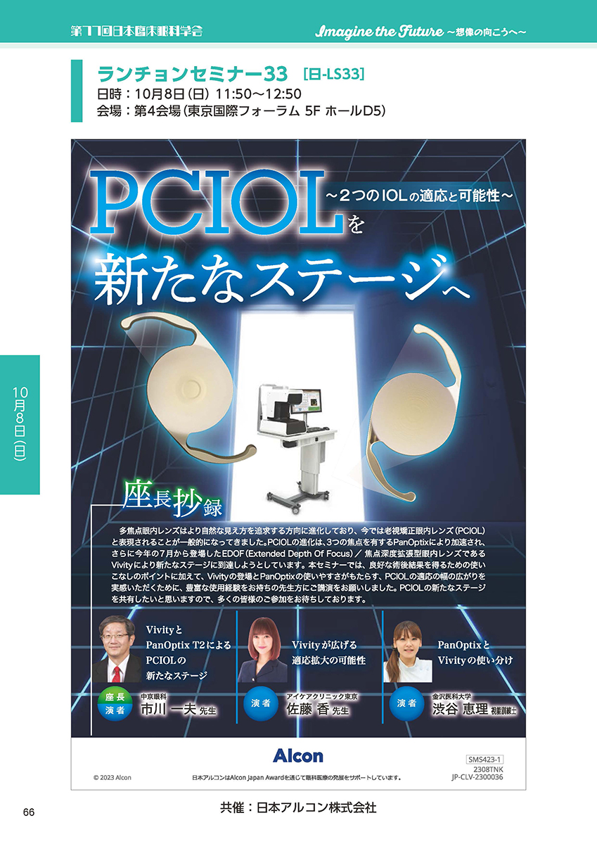 ランチョンセミナー33 PCIOLを新たなステージへ~2つのIOLの適応と可能性~ 2023年10月8日(日) 11:50 - 12:50 第4会場 | 東京国際フォーラム 5F ホールD5 共催:日本アルコン株式会社 |