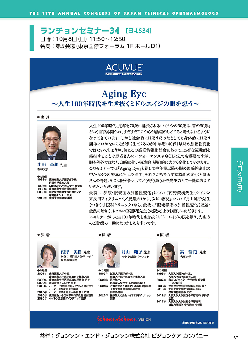 ランチョンセミナー34 Aging Eye ~人生100年時代を生き抜くミドルエイジの眼を想う~ 2023年10月8日(日) 11:50 - 12:50 第5会場 | 東京国際フォーラム 1F ホールD1 共催:ジョンソン・エンド・ジョンソン株式会社 ビジョンケア カンパニー |