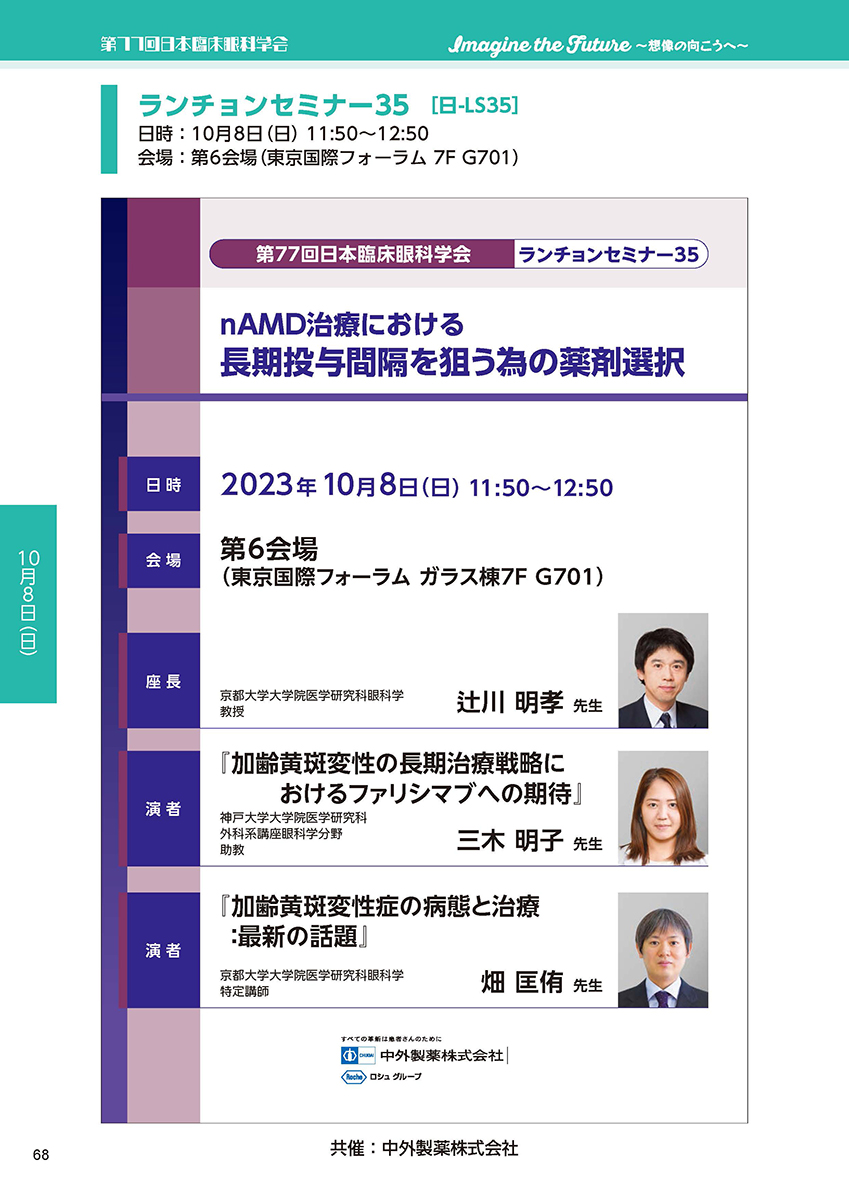 ランチョンセミナー35 nAMD治療における長期投与間隔を狙う為の薬剤選択 2023年10月8日(日) 11:50 - 12:50 第6会場 | 東京国際フォーラム 7F G701 共催:中外製薬株式会社 |