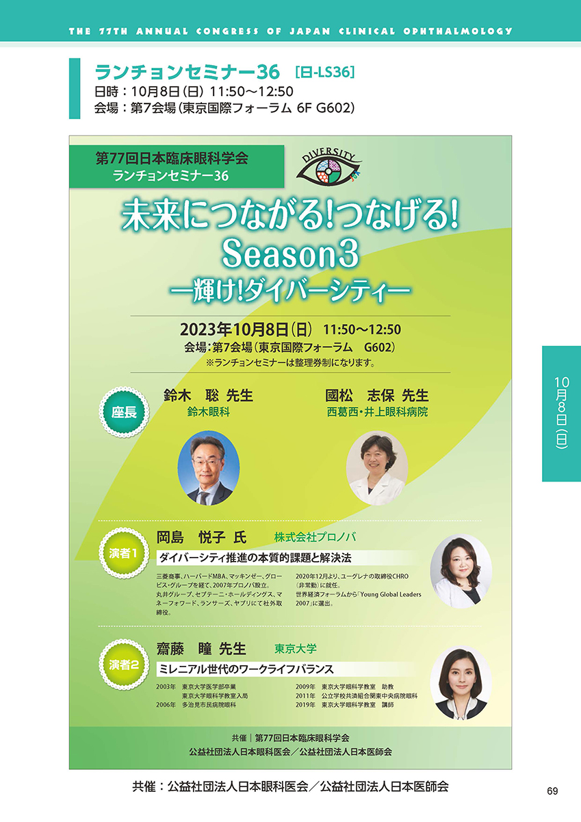 ランチョンセミナー36 未来につながる!つなげる!Season3~輝け!ダイバーシティ~ 2023年10月8日(日) 11:50 - 12:50 第7会場 | 東京国際フォーラム 6F G602 共催:公益社団法人日本眼科医会/公益社団法人日本医師会 |