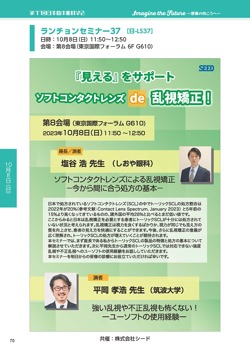 ランチョンセミナー37 『見える』をサポート ソフトコンタクトレンズ de 乱視矯正! 2023年10月8日(日) 11:50 - 12:50 第8会場 | 東京国際フォーラム 6F G610 共催:株式会社シード |
