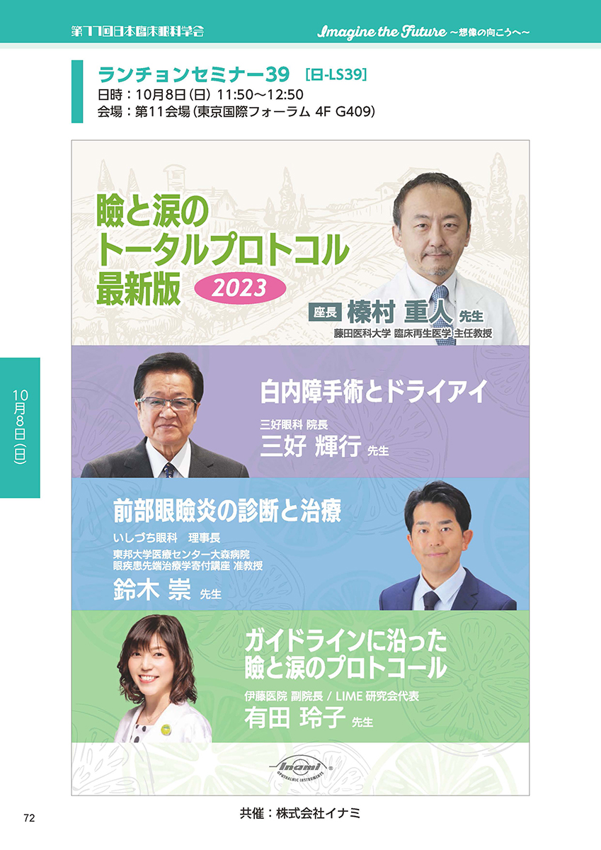 ランチョンセミナー39 瞼と涙のトータルプロトコル最新版 2023 2023年10月8日(日) 11:50 - 12:50 第11会場 | 東京国際フォーラム 4F G409 共催:株式会社イナミ |