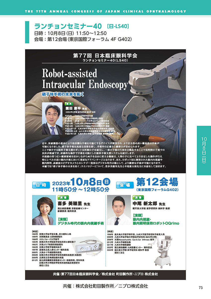 ランチョンセミナー40 硝子体手術の未来を拓く 2023年10月8日(日) 11:50 - 12:50 第12会場 | 東京国際フォーラム 4F G402 共催:株式会社町田製作所/ニプロ株式会社 |