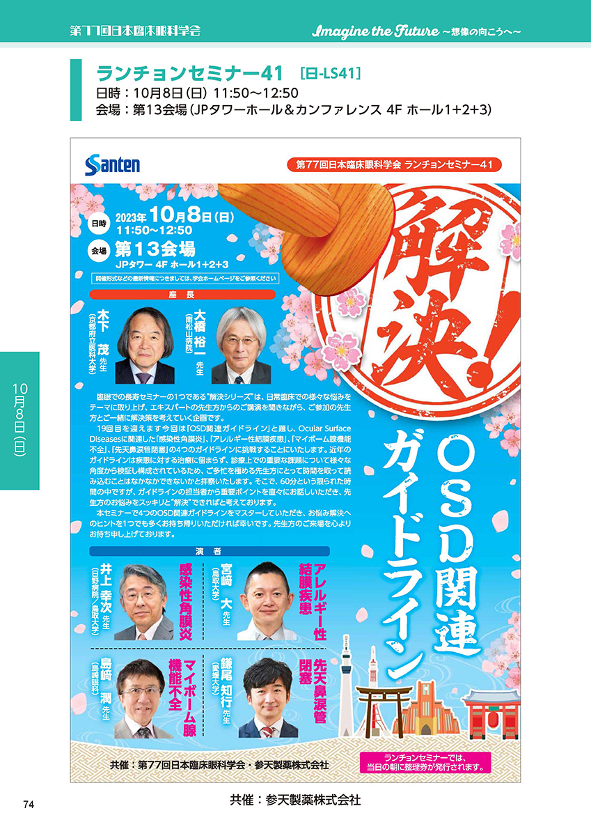 ランチョンセミナー41 解決!OSD関連ガイドライン 2023年10月8日(日) 11:50 - 12:50 第13会場 | JPタワーホール&カンファレンス 4F ホール1+2+3 共催:参天製薬株式会社 |
