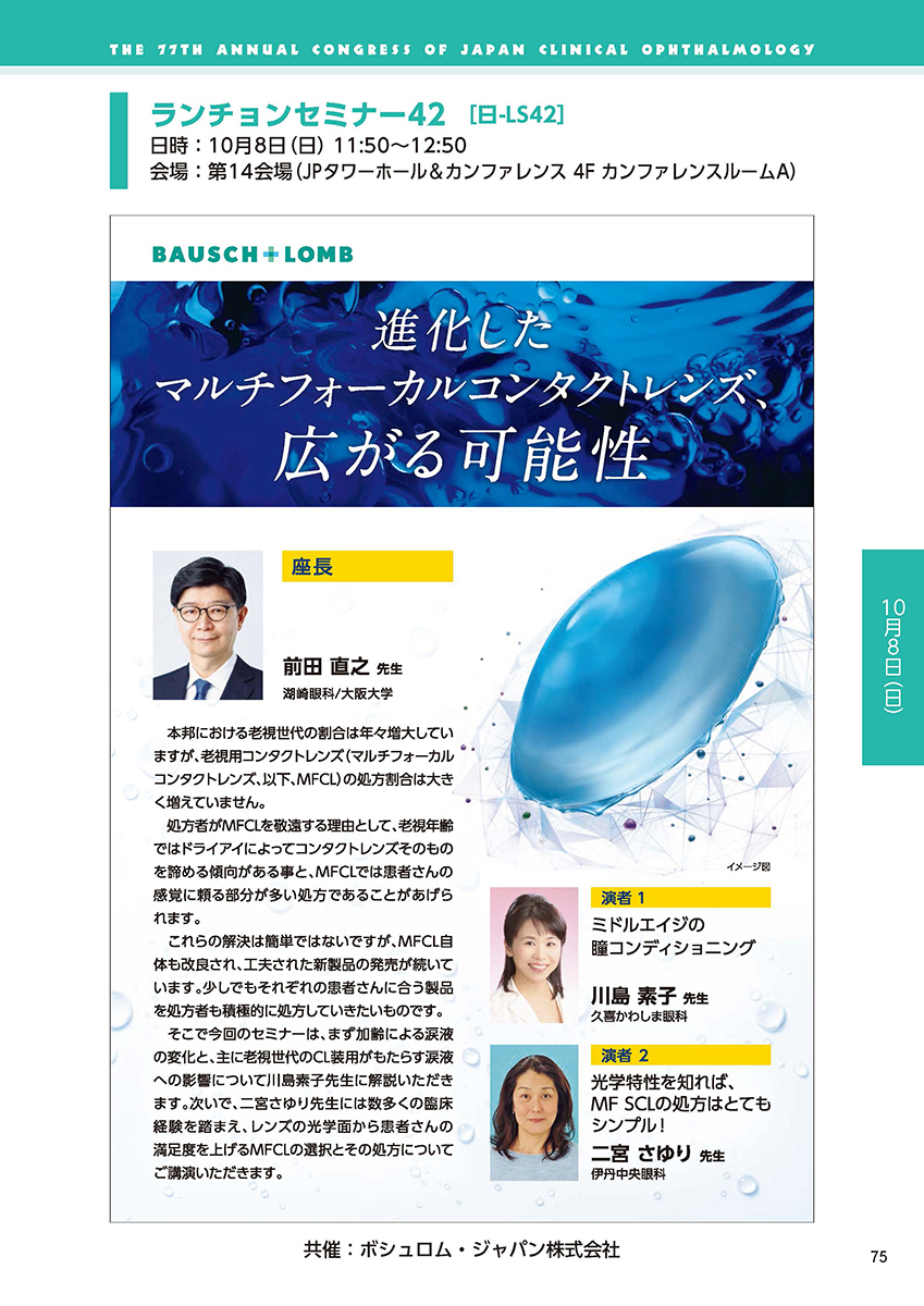 ランチョンセミナー42 進化したマルチフォーカルレンズ、広がる可能性 2023年10月8日(日) 11:50 - 12:50 第14会場 | JPタワーホール&カンファレンス 4F カンファレンスルームA 共催:ボシュロム・ジャパン株式会社 |