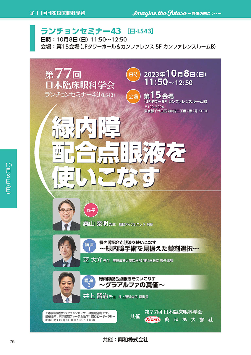ランチョンセミナー43 緑内障配合点眼液を使いこなす 2023年10月8日(日) 11:50 - 12:50 第15会場 | JPタワーホール&カンファレンス 5F カンファレンスルームB 共催:興和株式会社 |