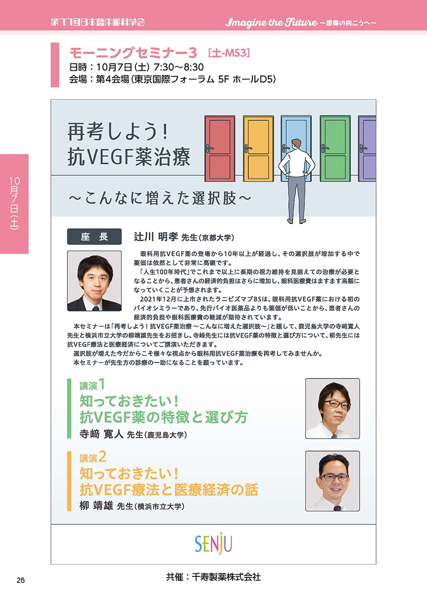 モーニングセミナー3 再考しよう! 抗VEGF薬治療 ~こんなに増えた選択肢~ 2023年10月7日(土) 7:30 - 8:30 第4会場 | 東京国際フォーラム 5F ホールD5 共催:千寿製薬株式会社 |