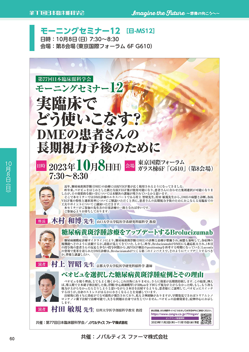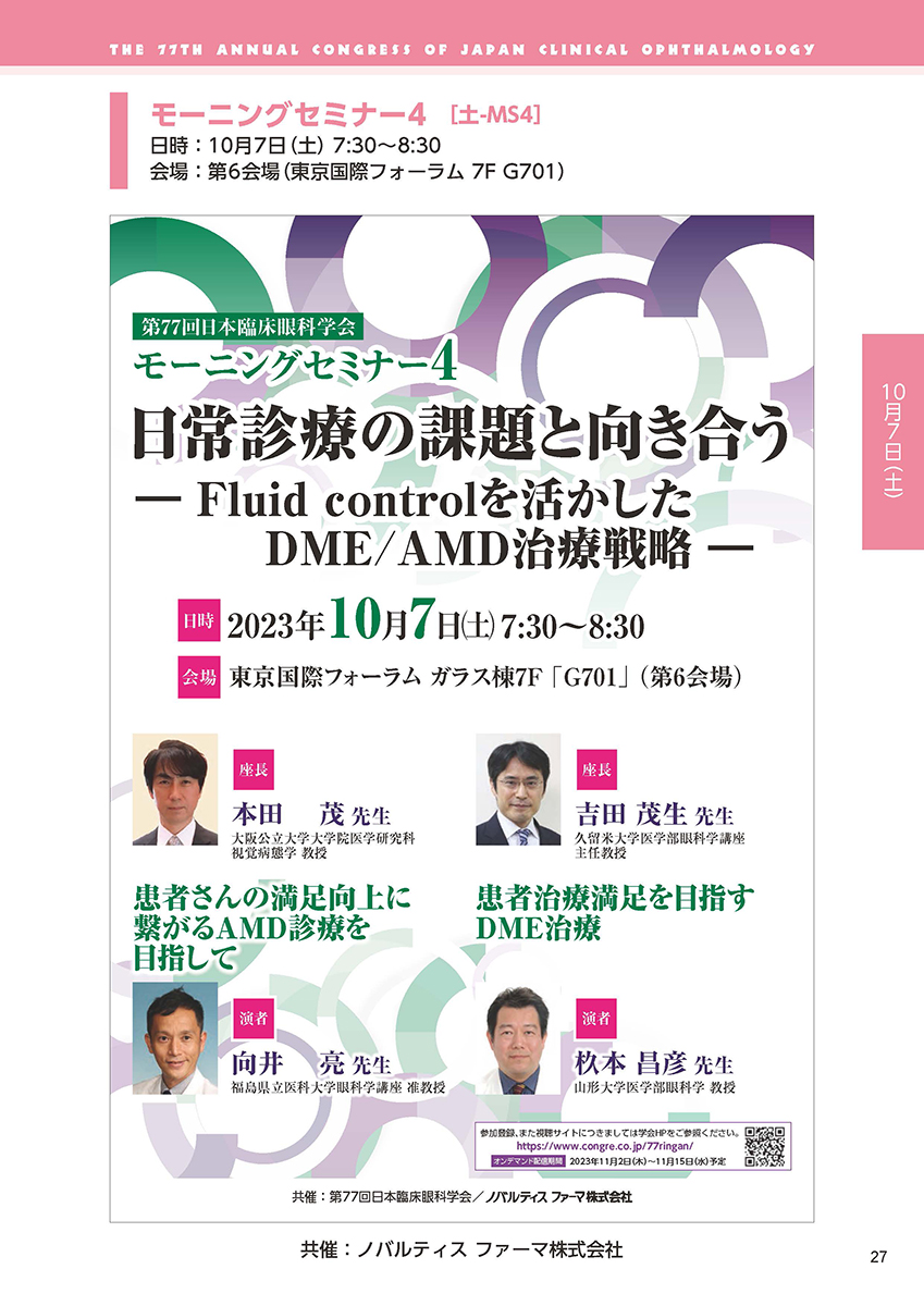 モーニングセミナー4 日常診療の課題と向き合う -Fluid controlを活かしたDME/AMD治療戦略- 2023年10月7日(土) 7:30 - 8:30 第6会場 | 東京国際フォーラム 7F G701 共催:ノバルティス ファーマ株式会社 |