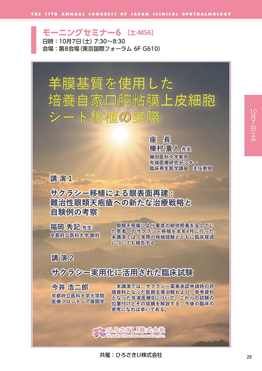 モーニングセミナー6 羊膜基質を使用した培養自家口腔粘膜上皮細胞シート移植の実際 2023年10月7日(土) 7:30 - 8:30 第8会場 | 東京国際フォーラム 6F G610 共催:ひろさきLI株式会社 |