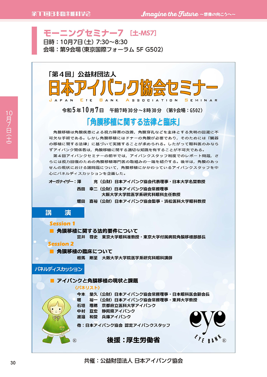 モーニングセミナー7 角膜移植に関する法律と臨床 2023年10月7日(土) 7:30 - 8:30 第9会場 | 東京国際フォーラム 5F G502 共催:公益財団法人日本アイバンク協会 |