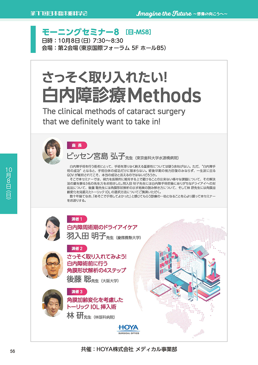 モーニングセミナー8 さっそく取り入れたい! 白内障診療Methods 2023年10月8日(日) 7:30 - 8:30 第2会場 | 東京国際フォーラム 5F ホールB5 共催:HOYA株式会社 メディカル事業部 |
