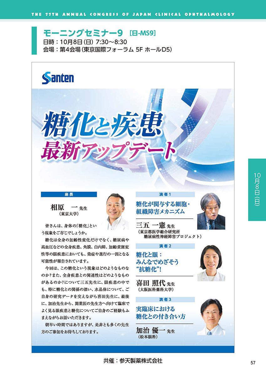 モーニングセミナー9 糖化と疾患 最新アップデート 2023年10月8日(日) 7:30 - 8:30 第4会場 | 東京国際フォーラム 5F ホールD5 共催:参天製薬株式会社 |