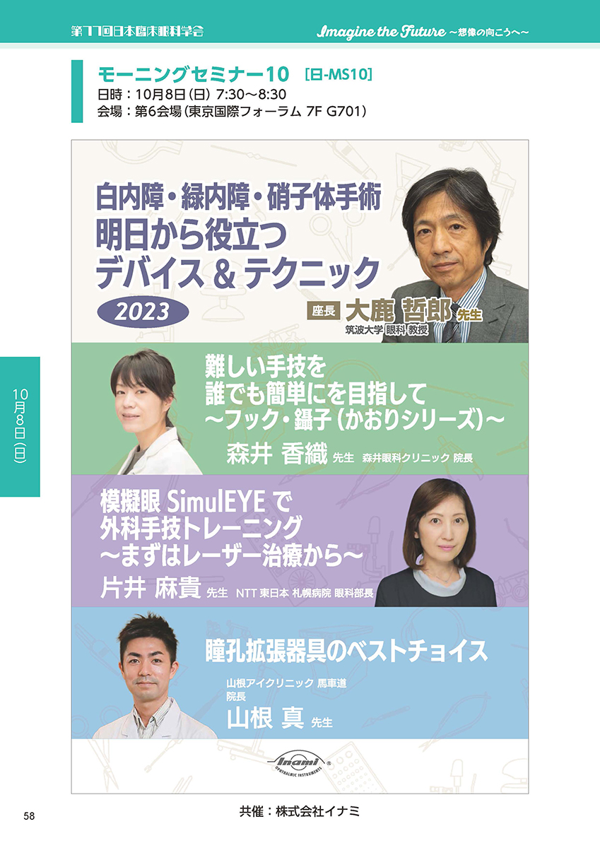 モーニングセミナー10 白内障・緑内障・硝子体手術 明日から役立つデバイス&テクニック2023 2023年10月8日(日) 7:30 - 8:30 第6会場 | 東京国際フォーラム 7F G701 共催:株式会社イナミ |
