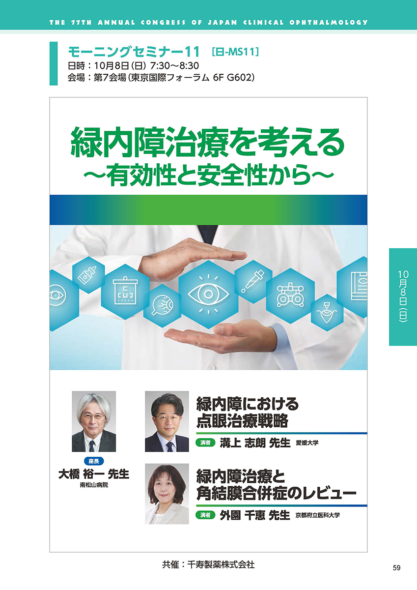 モーニングセミナー11 緑内障治療を考える ~有効性と安全性から~ 2023年10月8日(日) 7:30 - 8:30 第7会場 | 東京国際フォーラム 6F G602 共催:千寿製薬株式会社 |