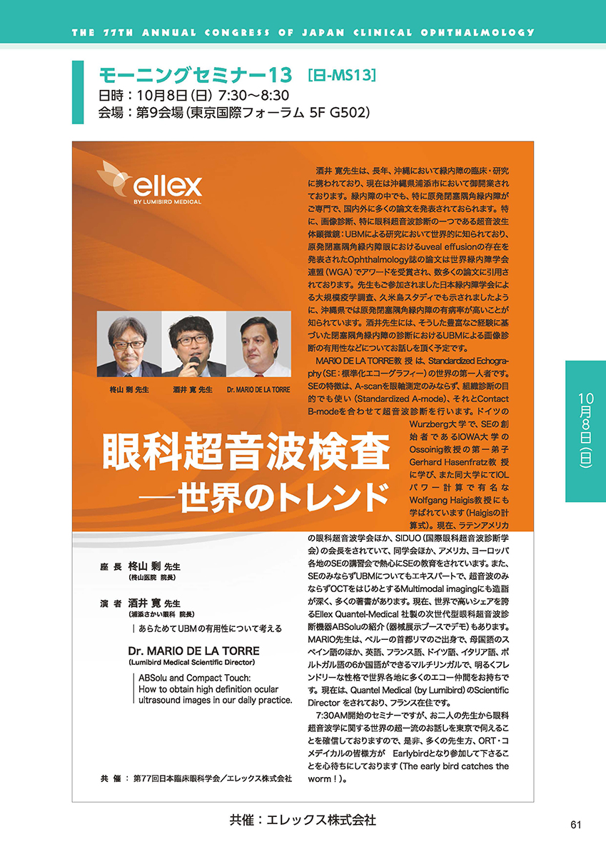 モーニングセミナー13 眼科超音波検査―世界のトレンド 2023年10月8日(日) 7:30 - 8:30 第9会場 | 東京国際フォーラム 5F G502 共催:エレックス株式会社 |