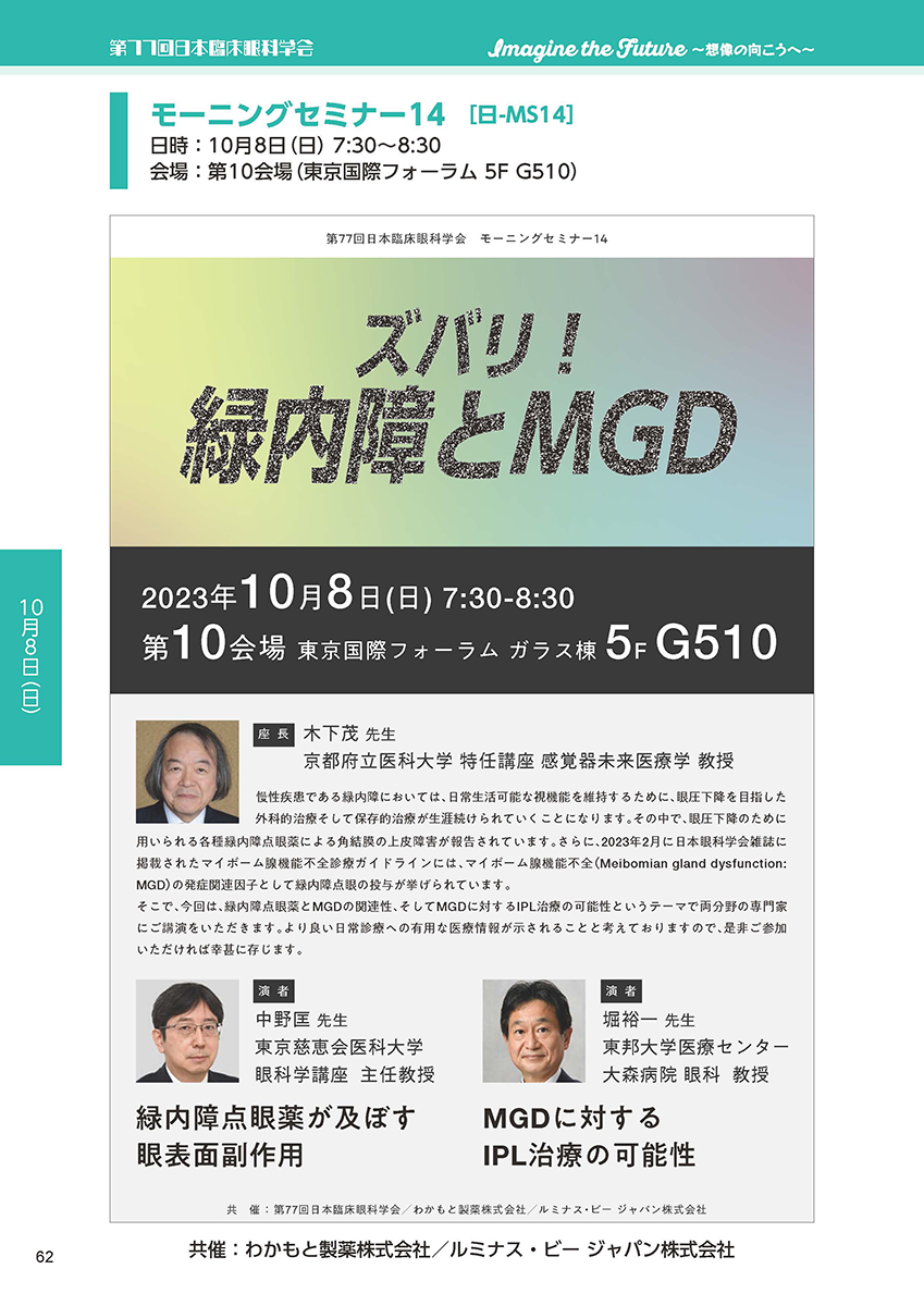 モーニングセミナー14 ズバリ!緑内障とMGD 2023年10月8日(日) 7:30 - 8:30 第10会場 | 東京国際フォーラム 5F G510 共催:わかもと製薬株式会社/ルミナス・ビー ジャパン株式会社 |
