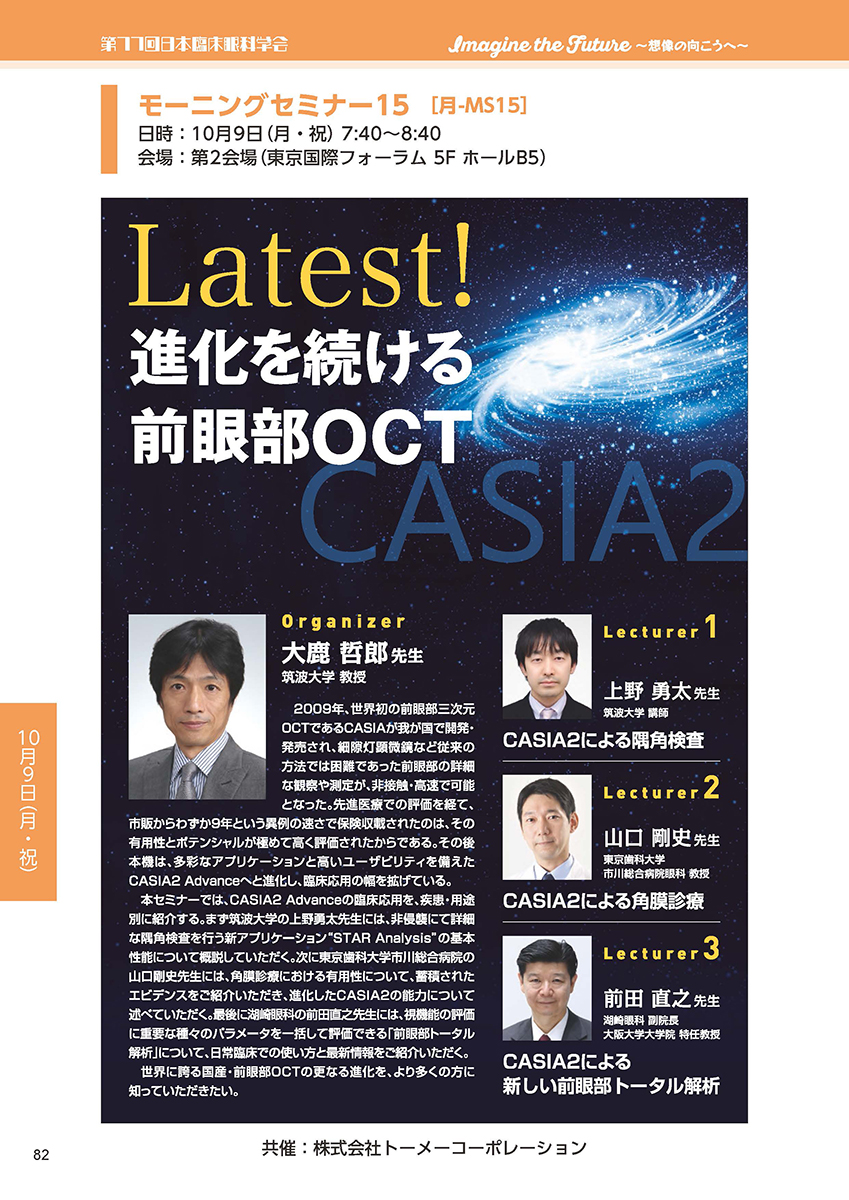 モーニングセミナー15 Latest! 進化を続ける 前眼部OCT 2023年10月9日(月) 7:40 - 8:40 第2会場 | 東京国際フォーラム 5F ホールB5 共催:株式会社トーメーコーポレーション |