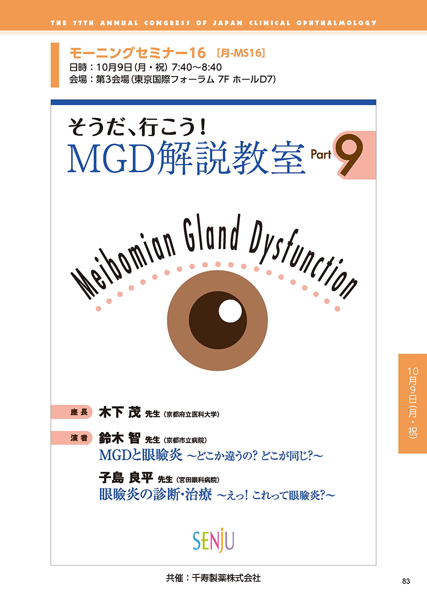 モーニングセミナー16 そうだ、行こう!MGD解説教室Part9 2023年10月9日(月) 7:40 - 8:40 第3会場 | 東京国際フォーラム 7F ホールD7 共催:千寿製薬株式会社 |