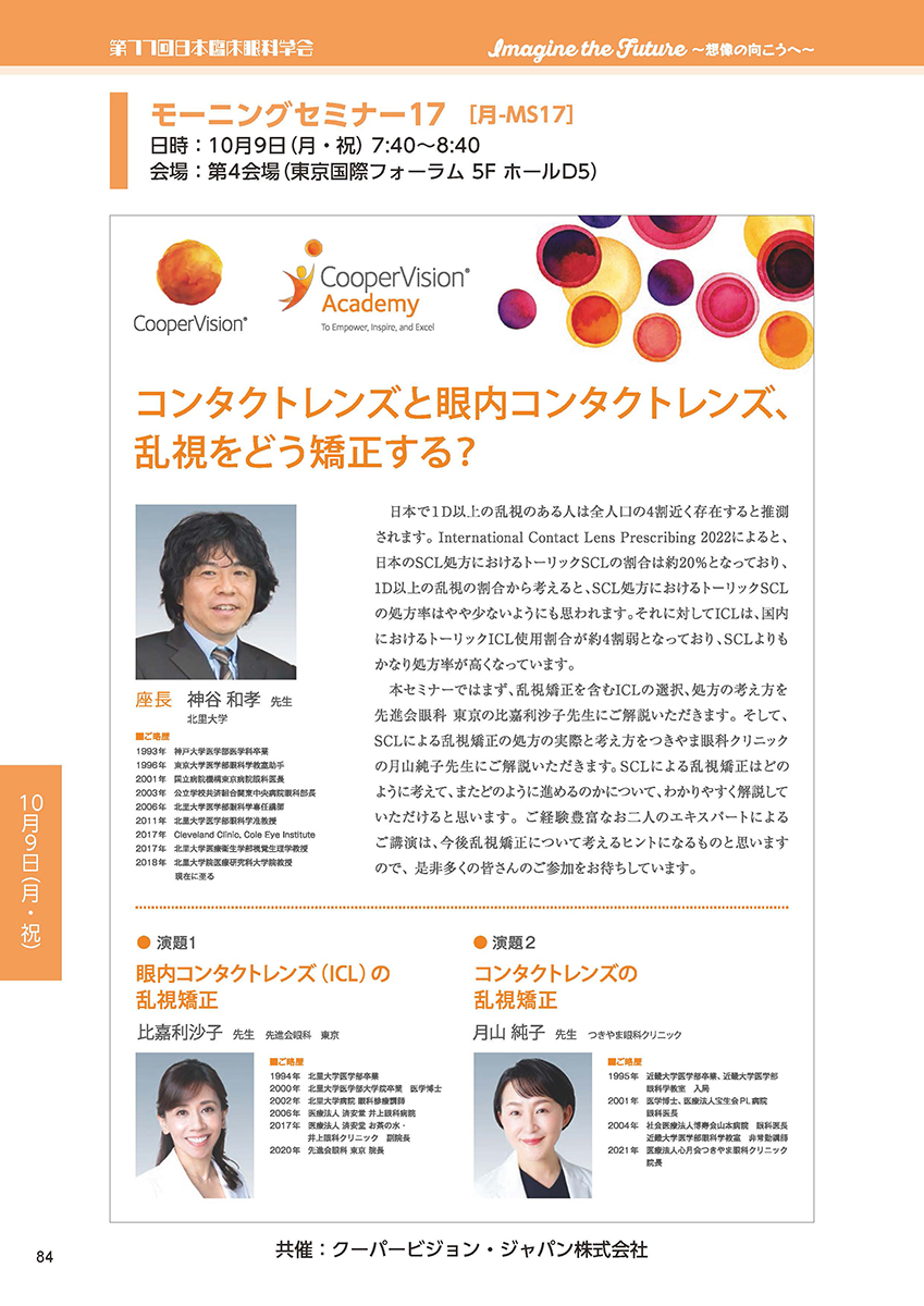 モーニングセミナー17 コンタクトレンズと眼内コンタクトレンズ、乱視をどう矯正する? 2023年10月9日(月) 7:40 - 8:40 第4会場 | 東京国際フォーラム 5F ホールD5 共催:クーパービジョン・ジャパン株式会社 |