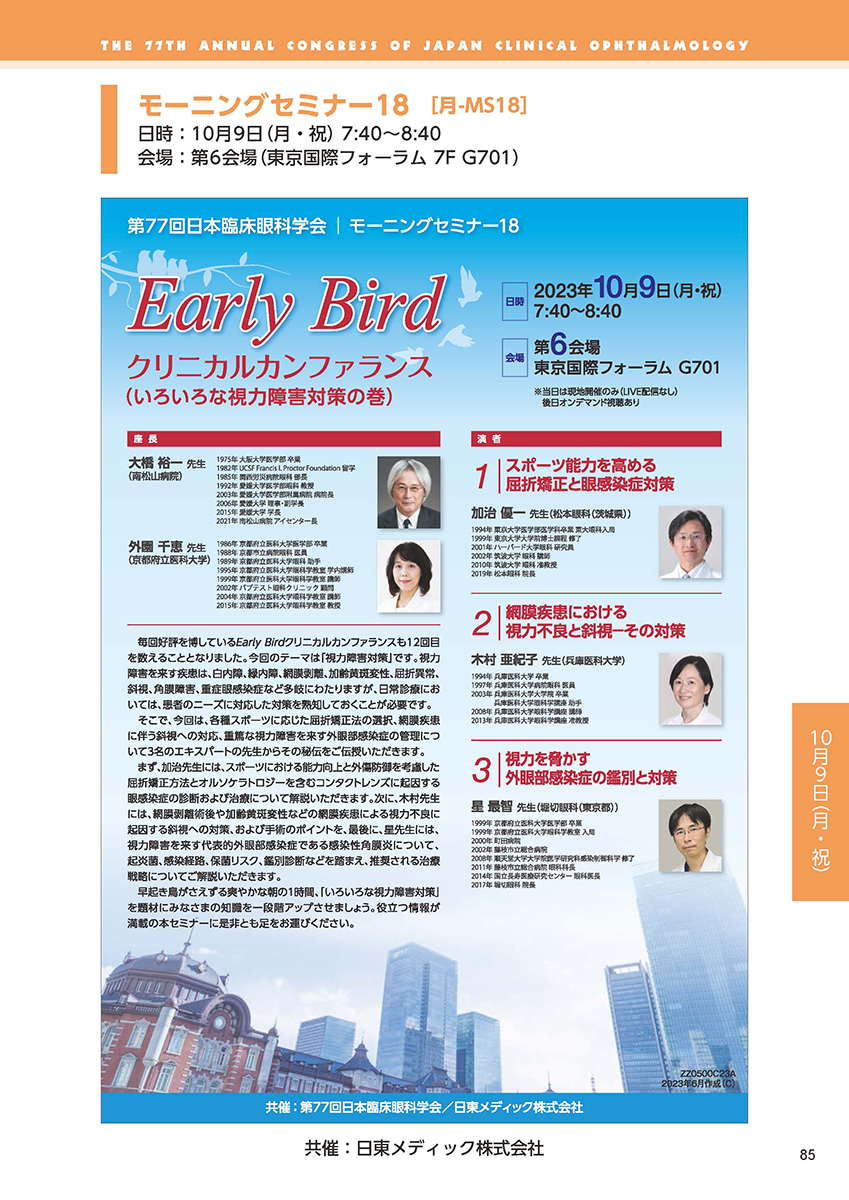モーニングセミナー18 Early Bird クリニカルカンファランス(いろいろな視力障害対策の巻) 2023年10月9日(月) 7:40 - 8:40 第6会場 | 東京国際フォーラム 7F G701 共催:日東メディック株式会社 |