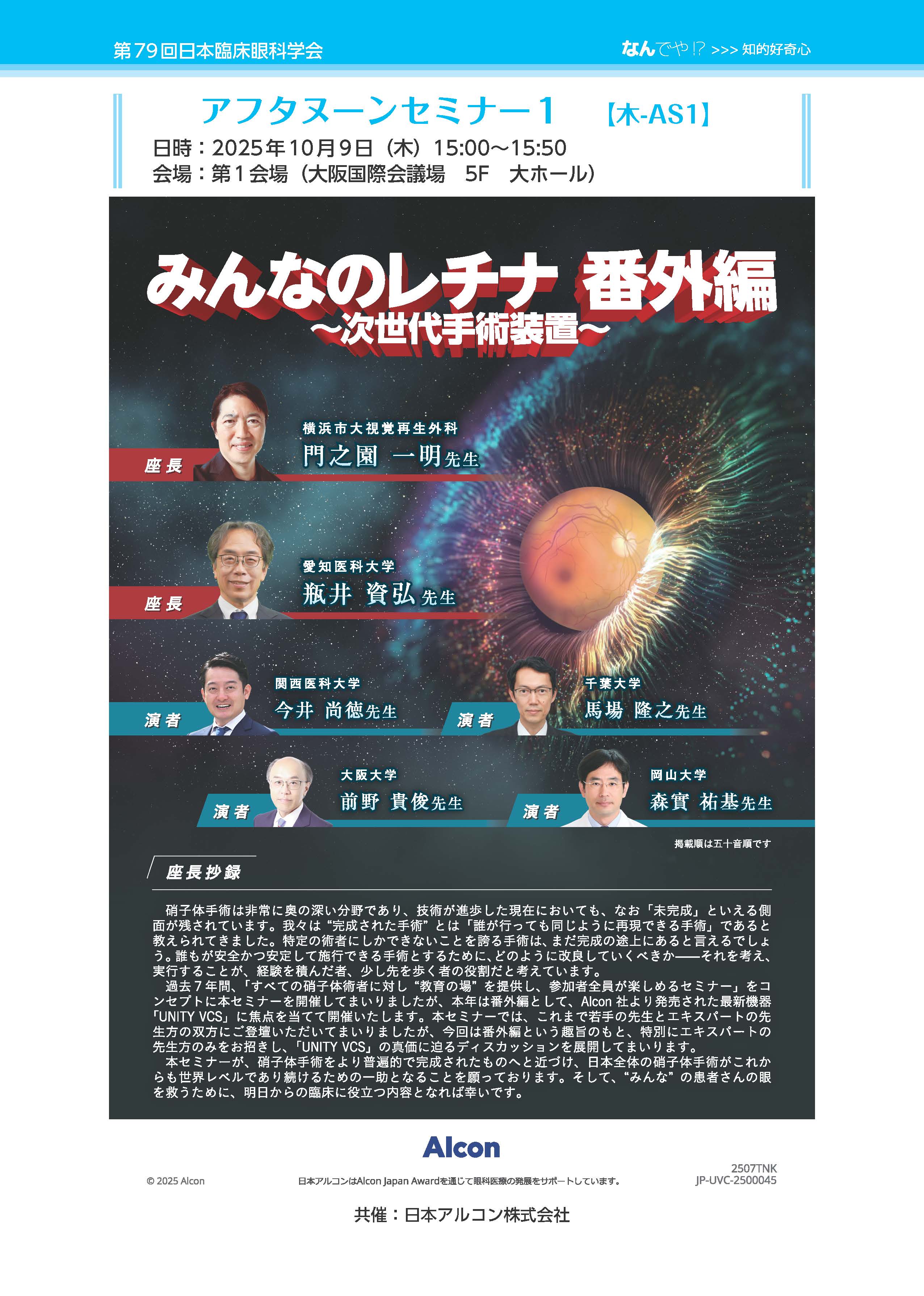 アフタヌーンセミナー 1 みんなのレチナ 番外編 ~次世代手術装置~ 2025年10月9日(木) 15:00 - 15:50 第1会場 | 大阪国際会議場 5F 大ホール 共催:日本アルコン株式会社 |