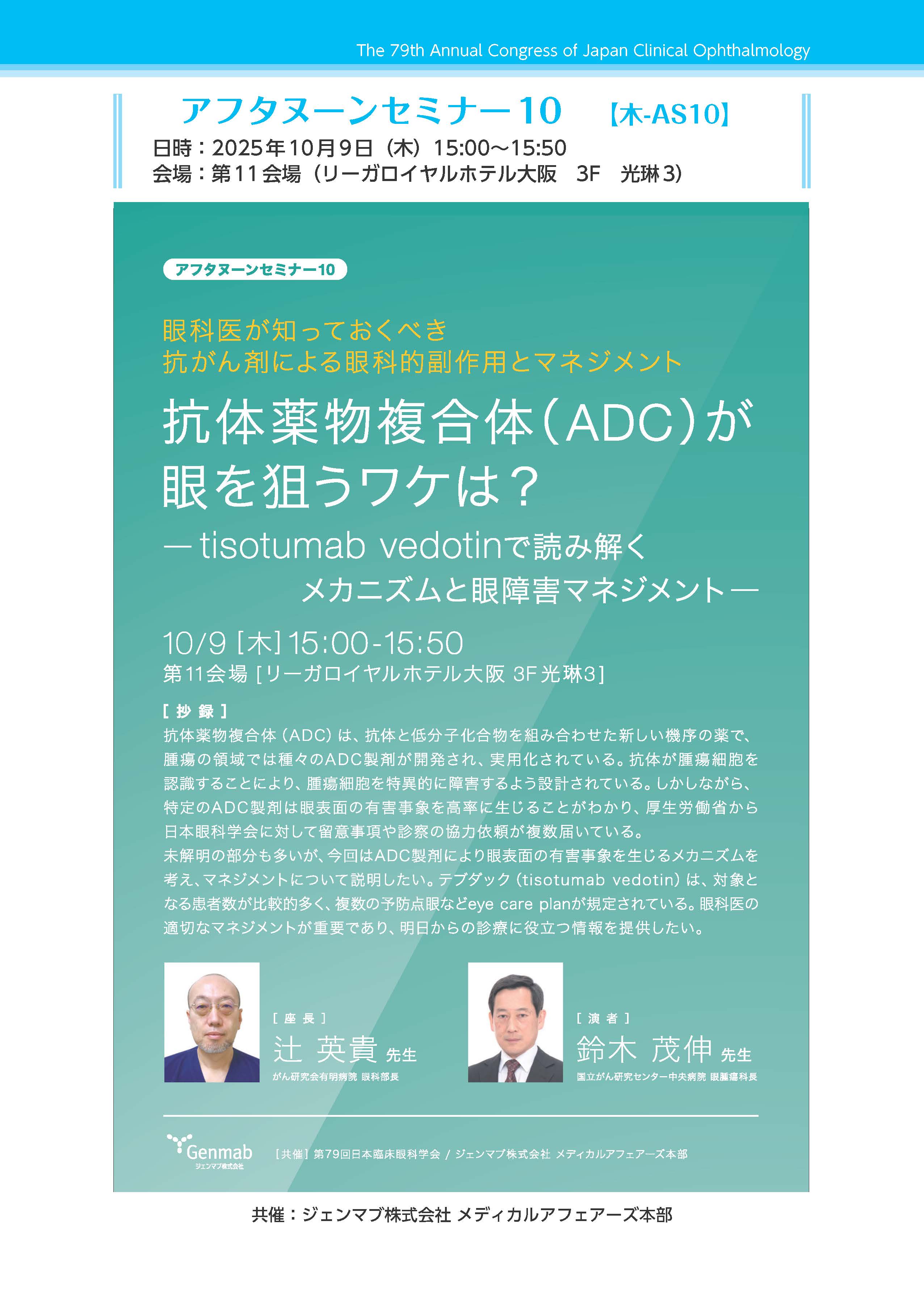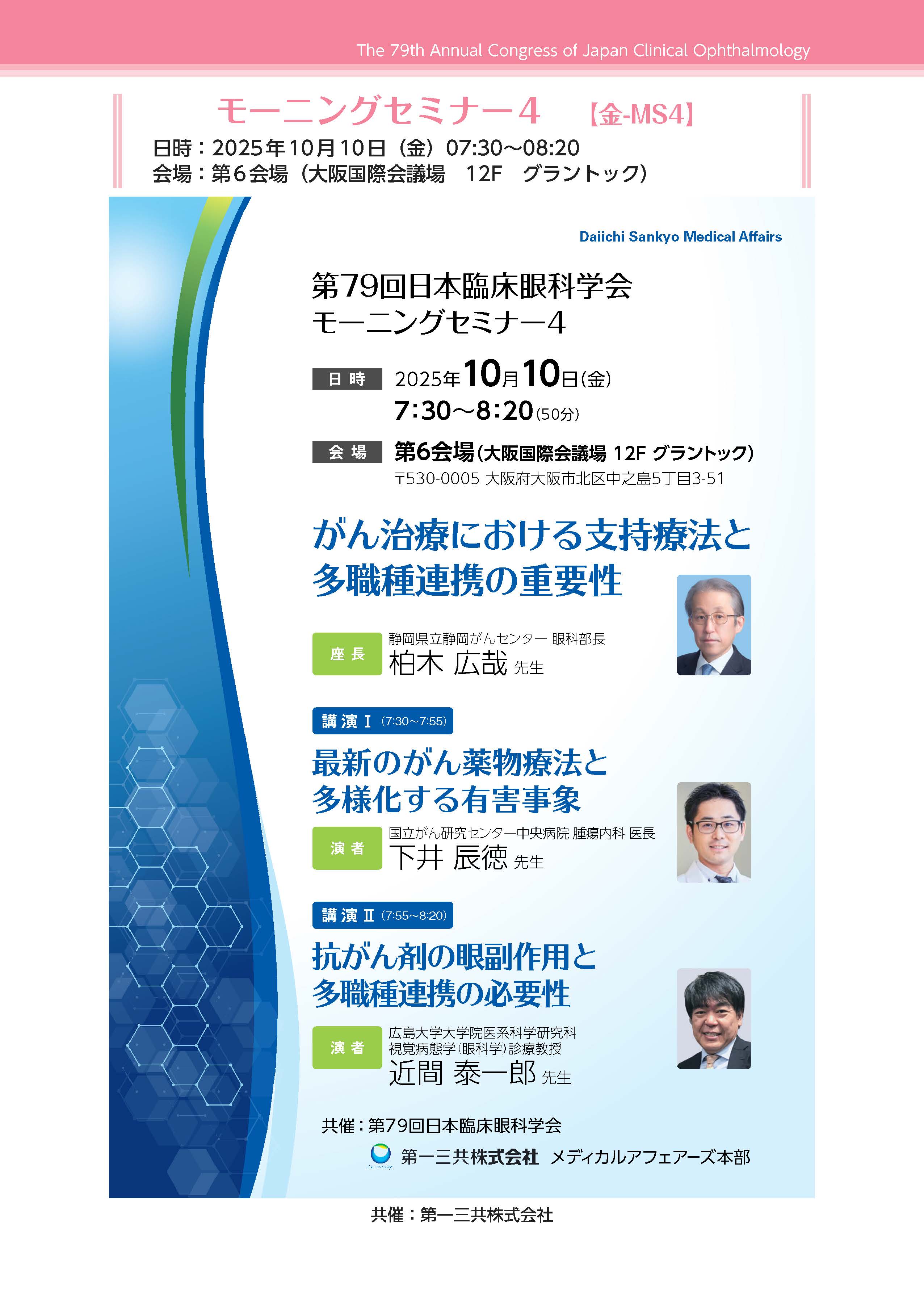 アフタヌーンセミナー 10 眼科医が知っておくべき抗がん剤による眼科的副作用とマネジメント 2025年10月9日(木) 15:00 - 15:50 第11会場 | リーガロイヤルホテル大阪 3F 光琳3 共催:ジェンマブ株式会社 メディカルフェアーズ本部 |