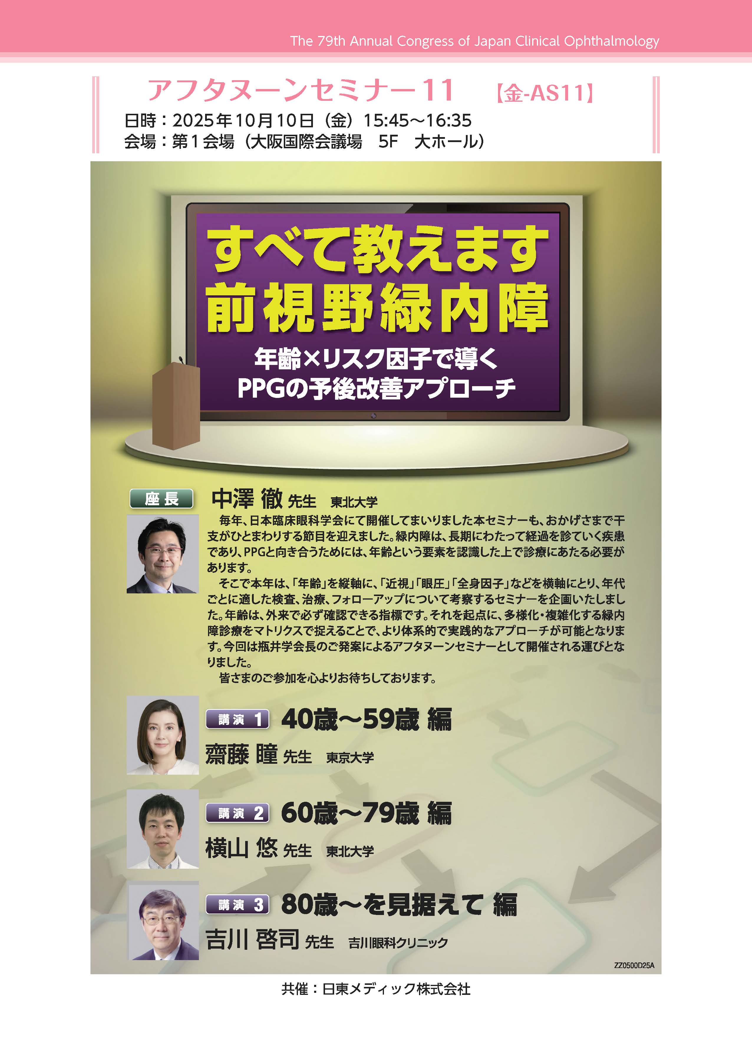 アフタヌーンセミナー 11 すべて教えます前視野緑内障 年齢×リスク因子で導くPPGの予後改善アプローチ 2025年10月10日(金) 15:45 - 16:35 第1会場 | 大阪国際会議場 5F 大ホール 共催:日東メディック株式会社 |
