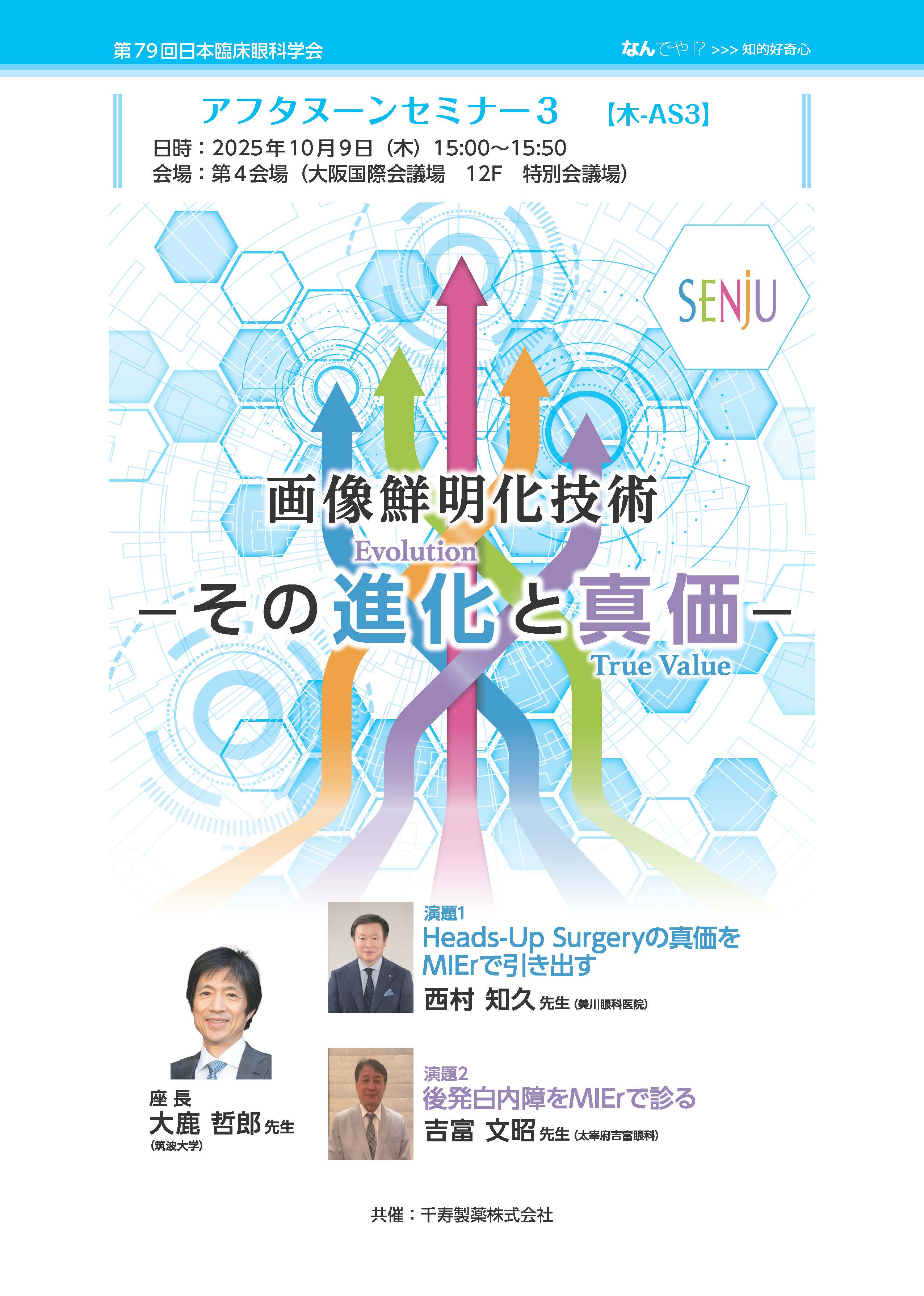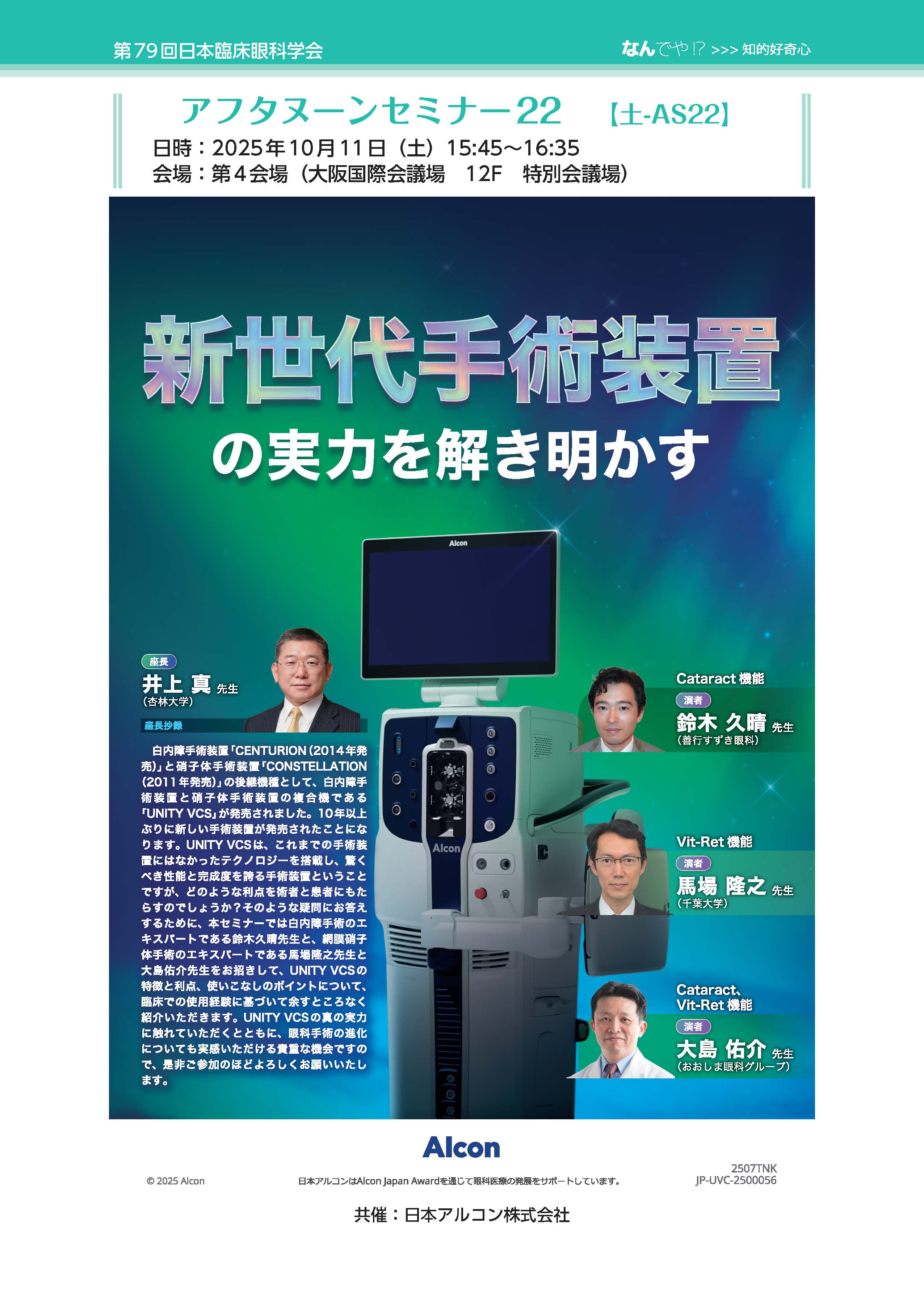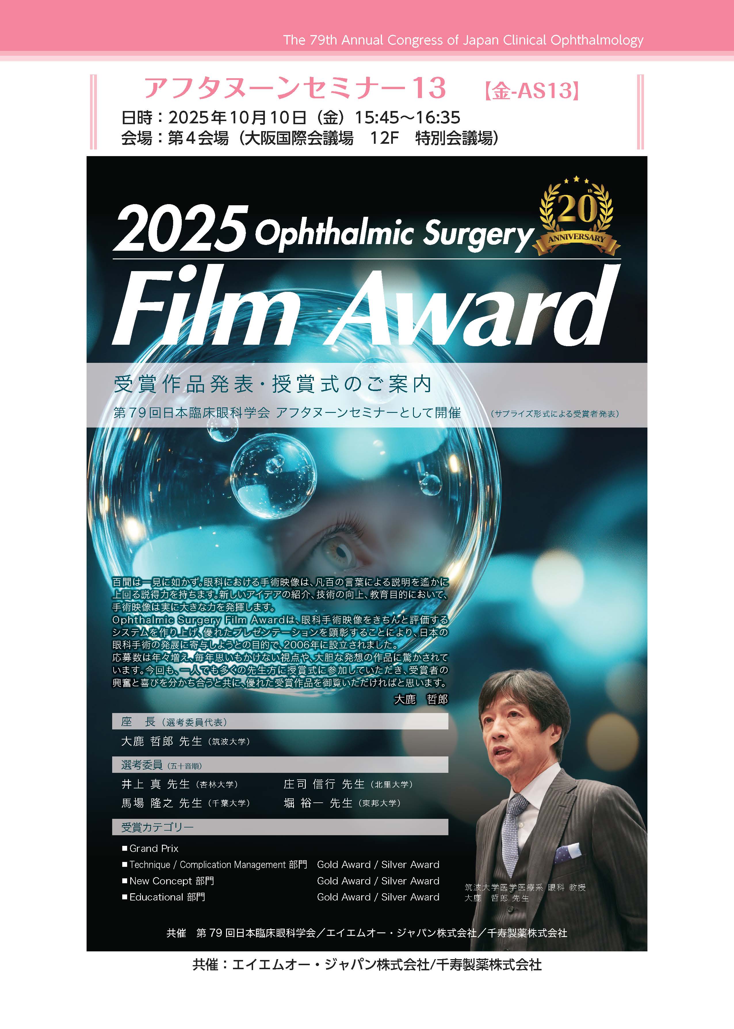 アフタヌーンセミナー13 2025 Ophthalmic Surgery Film Award 2025年10月10日(金) 15:45 - 16:35 第4会場 | 大阪国際会議場 12F 特別会議場 共催:エイエムオー・ジャパン株式会社/千寿製薬株式会社 |