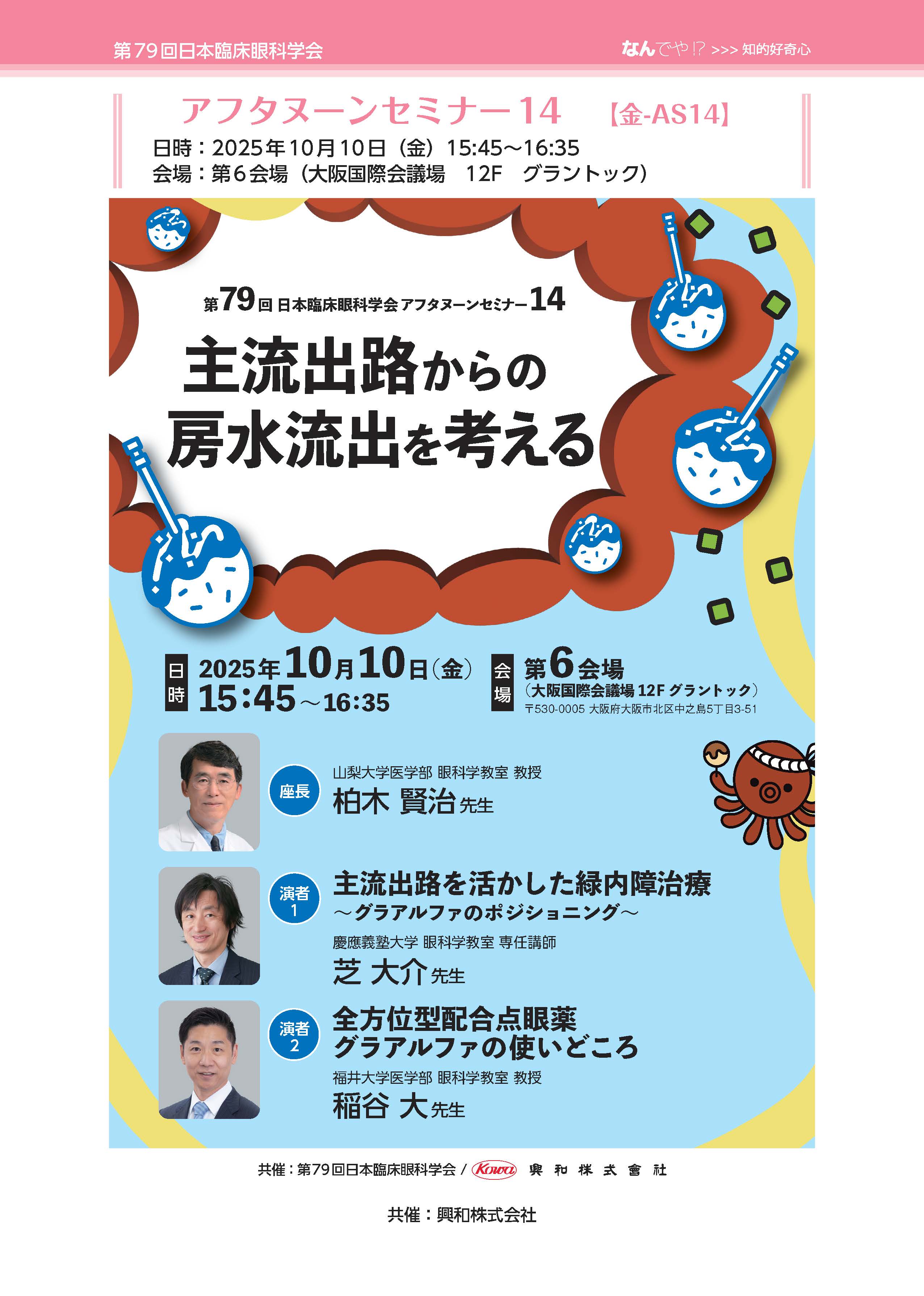 アフタヌーンセミナー 14 主流出路からの 房水流出を考える 2025年10月10日(金) 15:45 - 16:35 第6会場 | 大阪国際会議場 12F グラントック 共催:興和株式会社 |