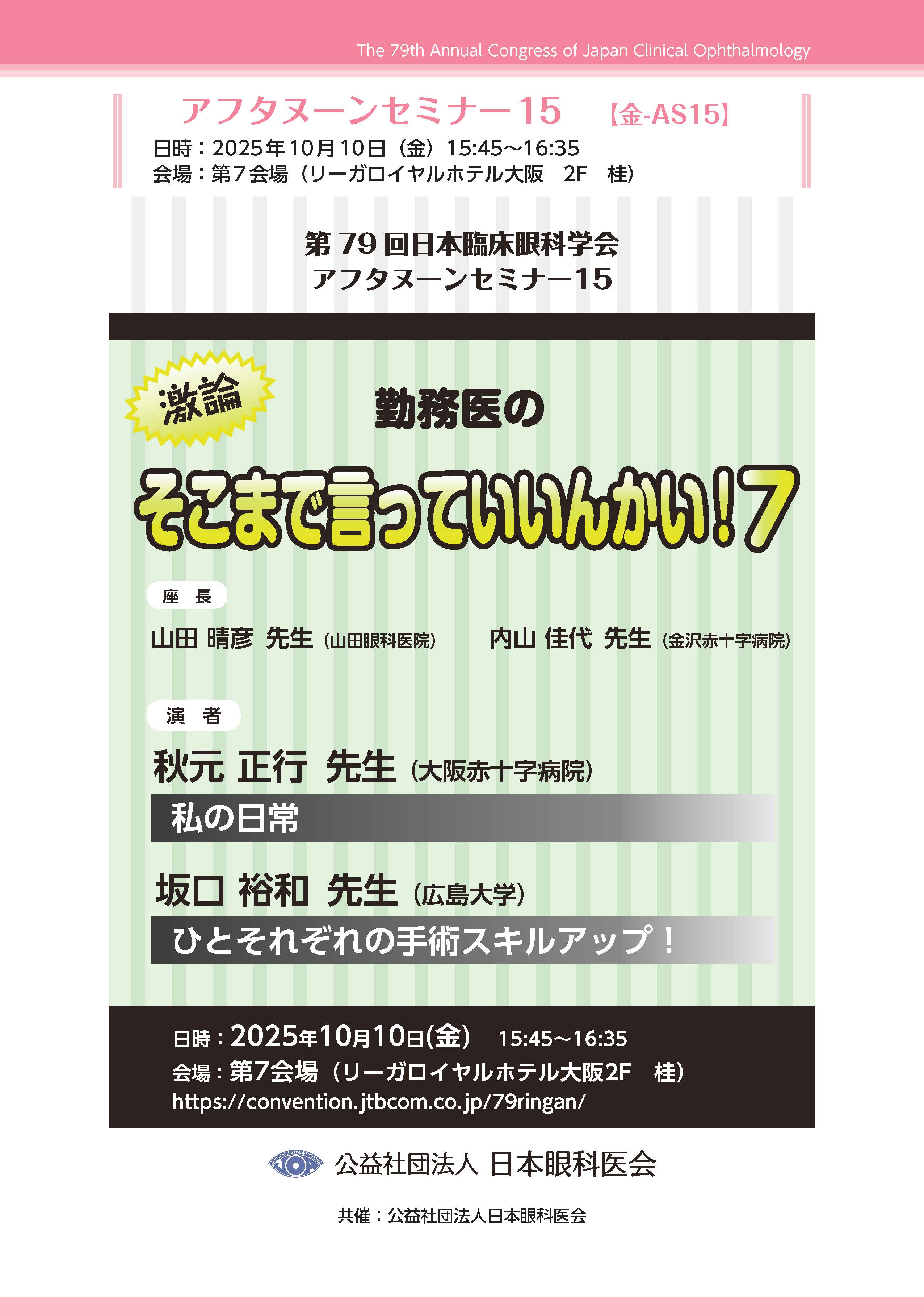 アフタヌーンセミナー 15 激論 勤務医のそこまで言っていいんかい!7 2025年10月10日(金) 15:45 - 16:35 第7会場 | リーガロイヤルホテル大阪 2F 桂 共催:公益社団法人日本眼科医会 |